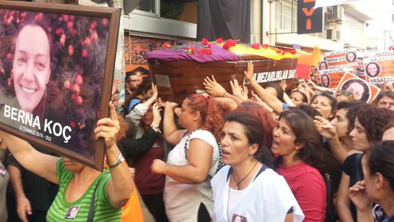 Berna Koç'un cenazesi yapılan törenin ardından kadınların omzunda kortejle Cumhuriyet Bulvarı'na taşındı. Cenazenin Konak Meydanı'na girmesine izin vermeyen polis ekipleri, 6 TOMA, 2 Akrep adı verilen araç ve çok sayıda Çevik Kuvvet ekibiyle güvenlik çemberi oluşturdu. Polis önlemine tepki gösteren vatandaşlar, el ele tutuşarak polisle cenaze arasına etten duvar ördü.