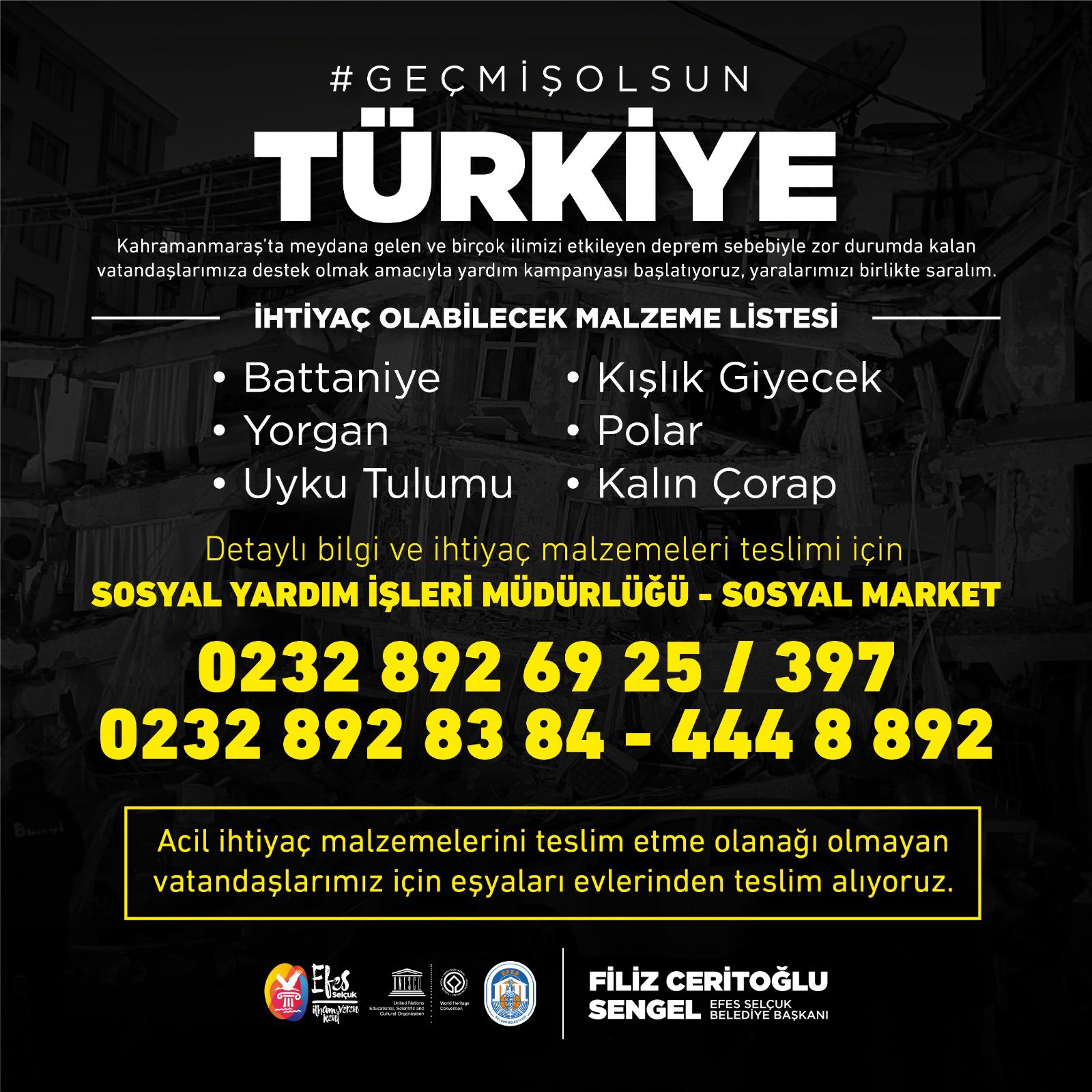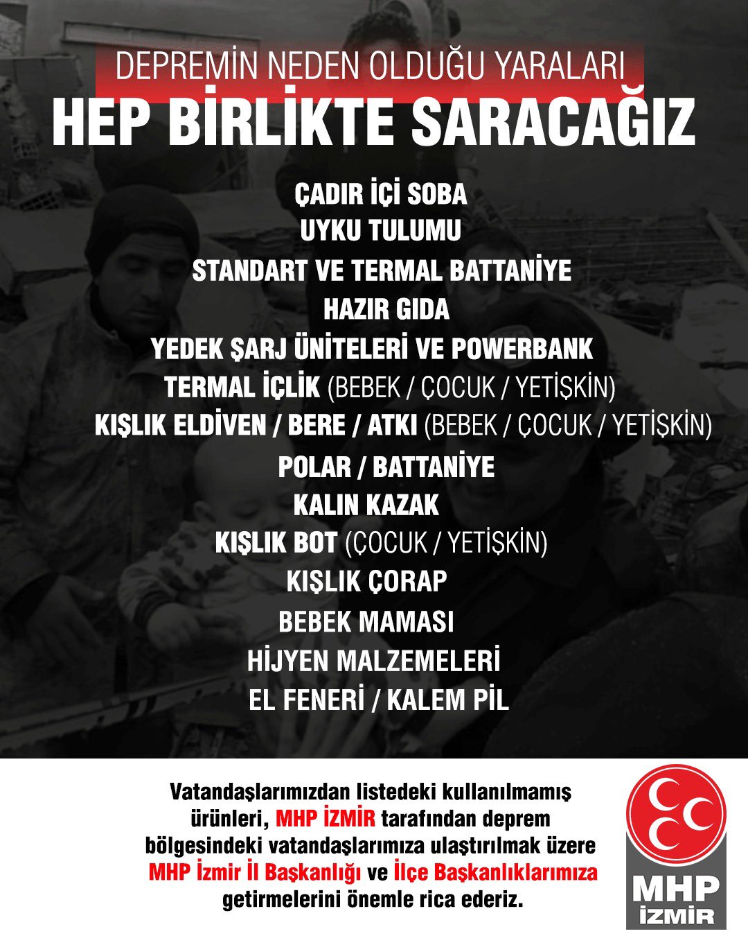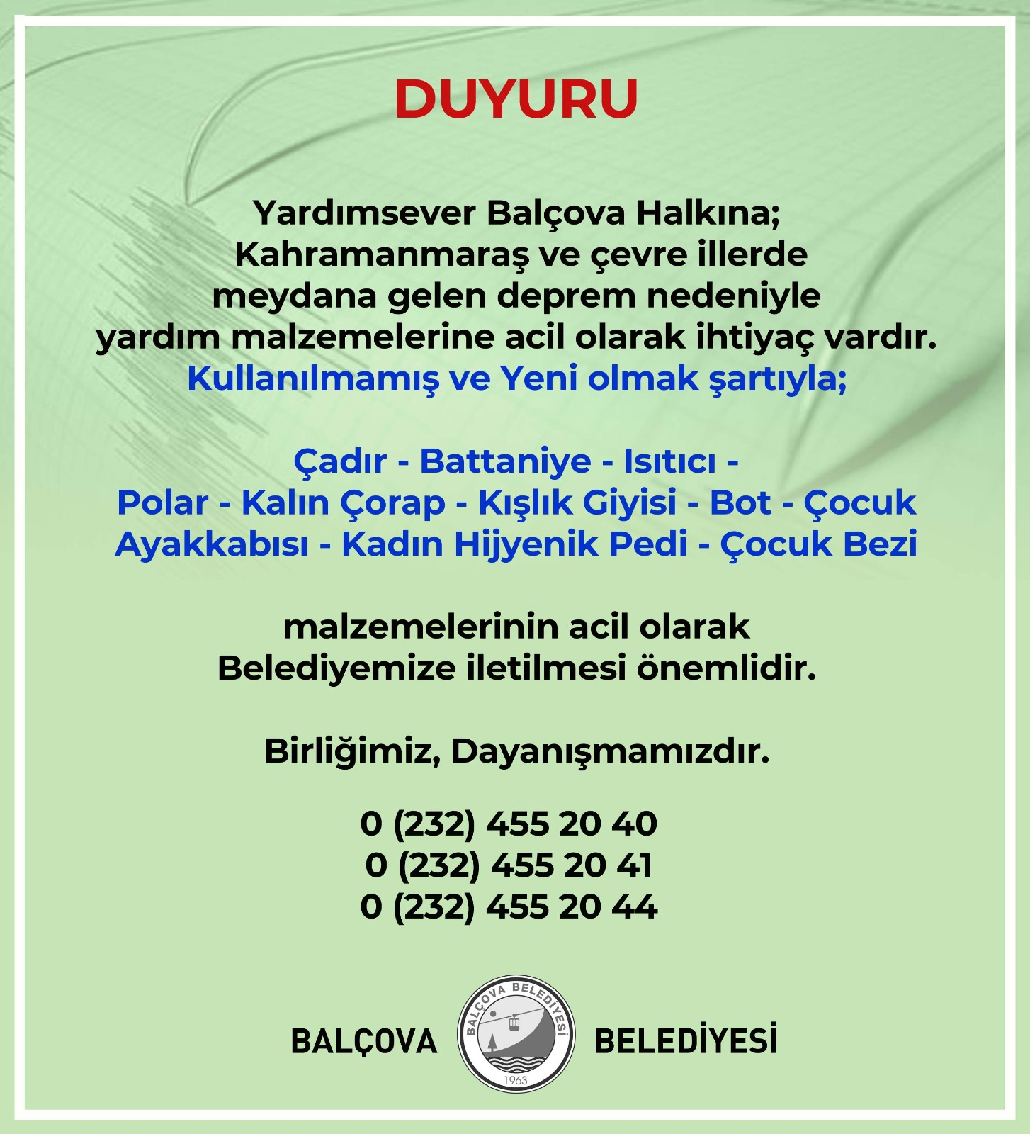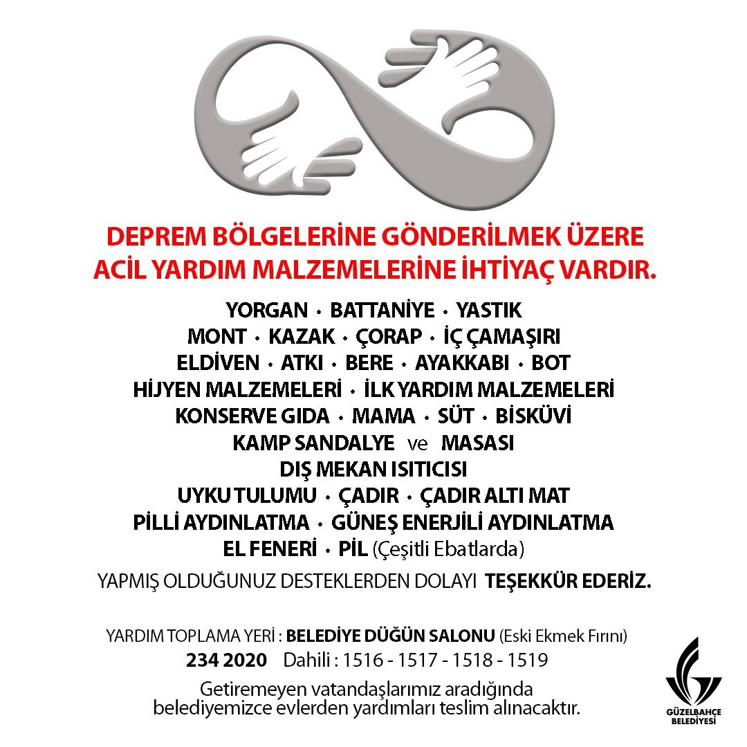 Deprem bölgesine gönderilmek üzere çadır, battaniye, tüplü soba, uyku tulumu, paketli hazır gıda, su, süt, bebek ihtiyaç malzemeleri, hijyen malzemesi, ışıldak, kullanılmamış kışlık giysi gibi malzemeleri Belediyemize iletebilirsiniz.