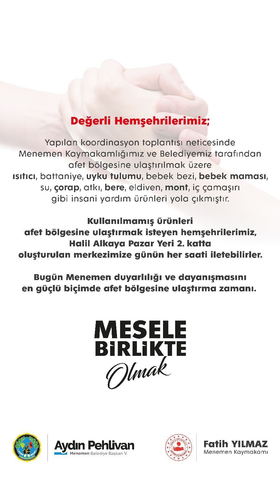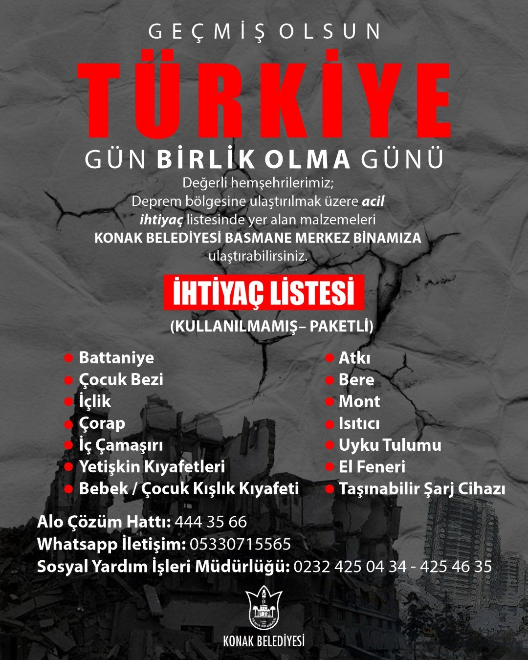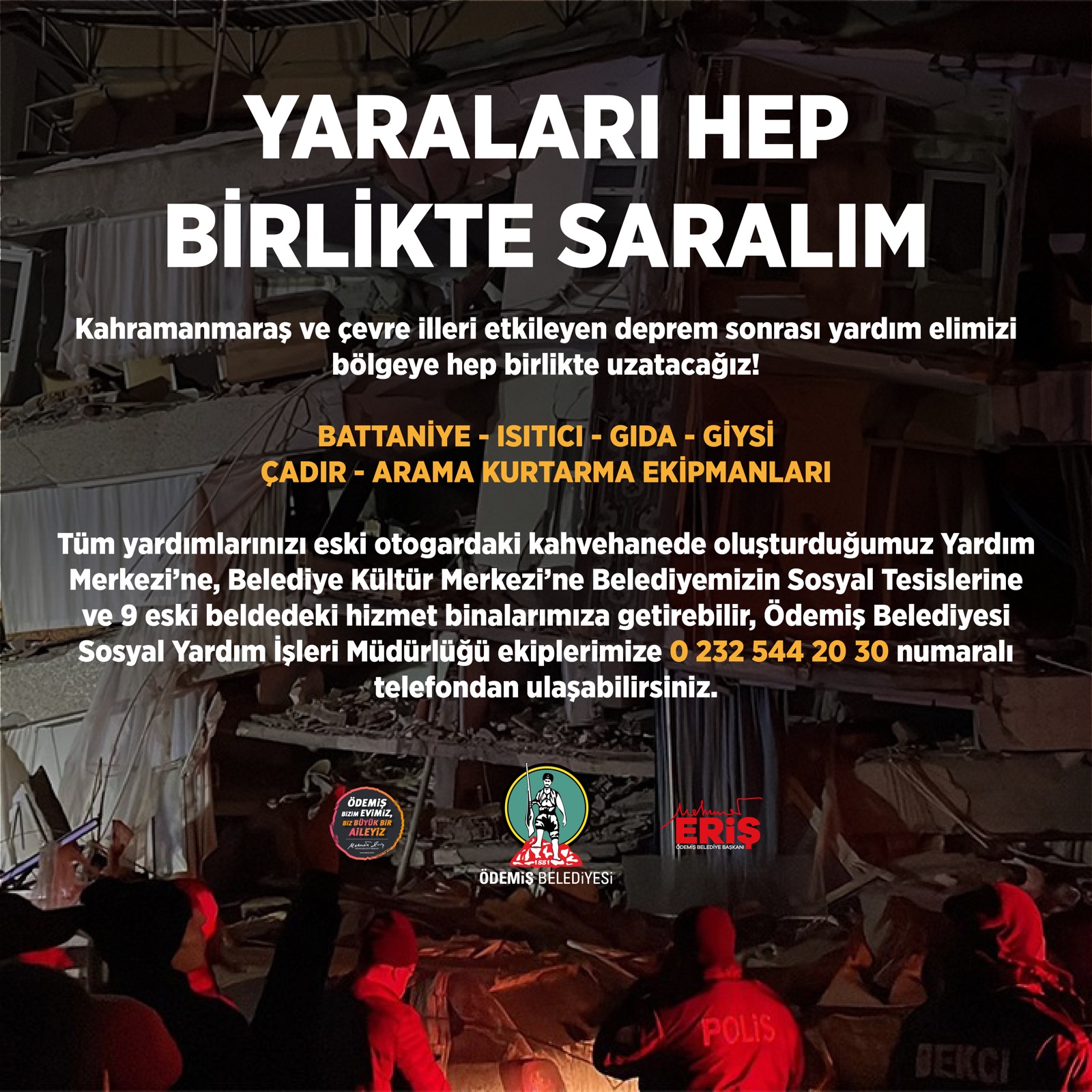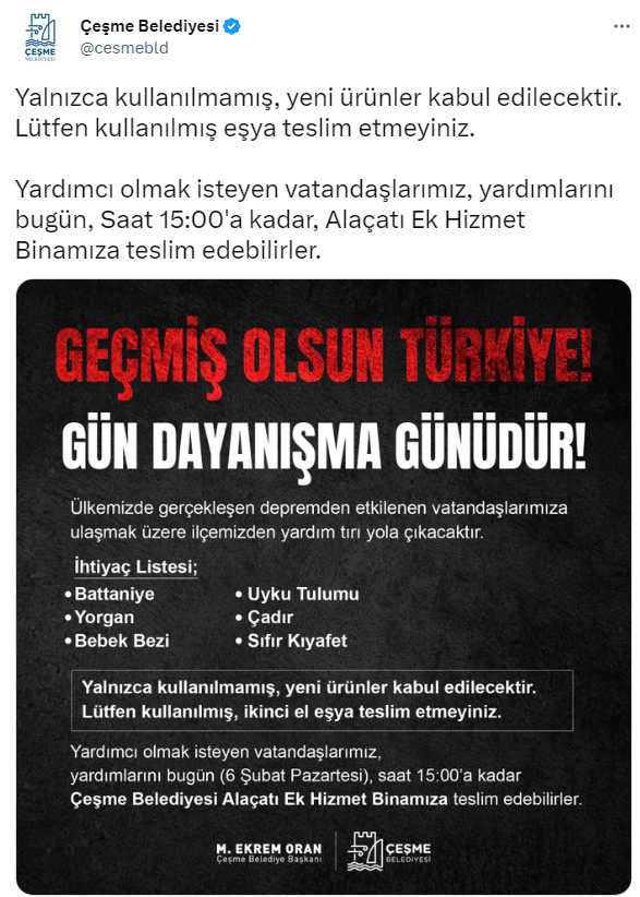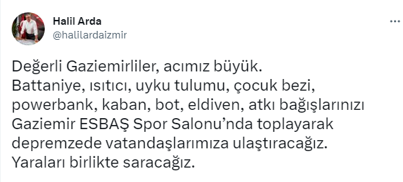 Soyer'in paylaşımlarında 'Değerli İzmirliler, Hemşehrilerimiz deprem bölgesine yardım ulaştırmak için bize başvuruyor. Acil ihtiyaç duyulan battaniye, ısıtıcı ve uyku tulumu (kullanılmamış) bağışlarını Gaziemir Fuar İzmir'de kabul edeceğiz. Büyük bir yardım kampanyasını da kısa zamanda duyuracağız.' ifadeleri yer aldı.