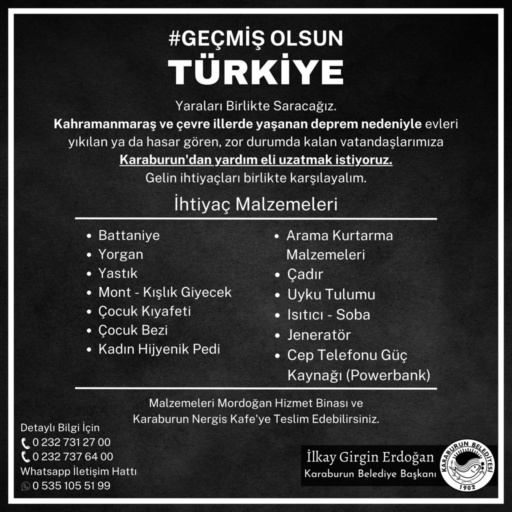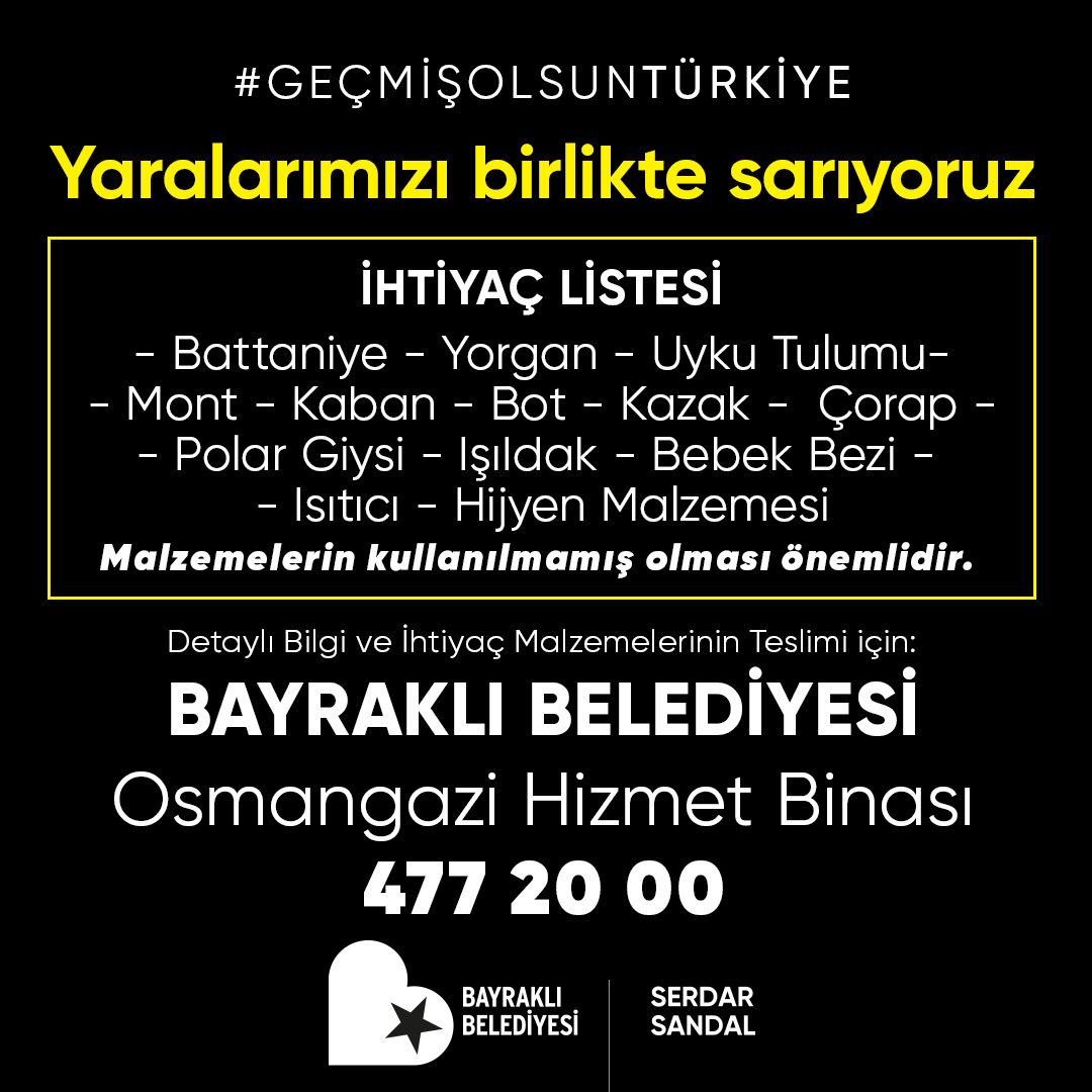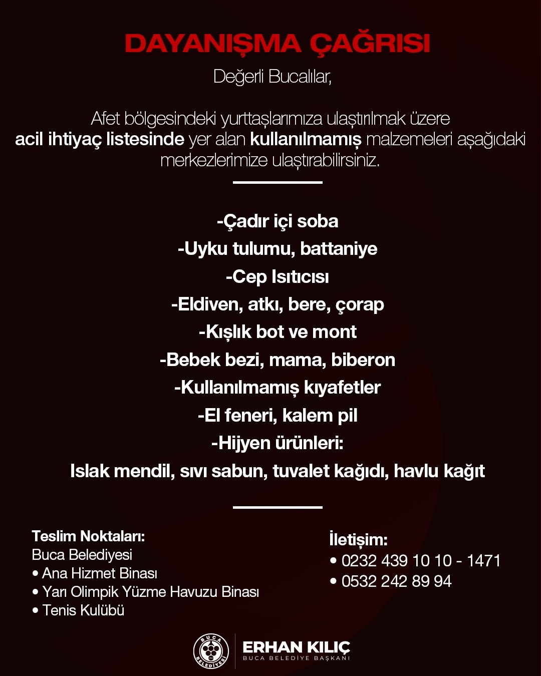 Belediye hizmet binası, Sancar Maruflu STK Yerleşkesi, Ali Rıza Bodur Eğitim Merkezi, Karşıyaka Mustafa Kemal Spor Salonu, Muharrem Candaş Spor Salonu, İsmail Cem Kültür Merkezi, Kemal Anadol Mah Mkz (Mustafa Kemal Mahallesi) yardım malzemeleri kabul edilecektir. 444 1 575