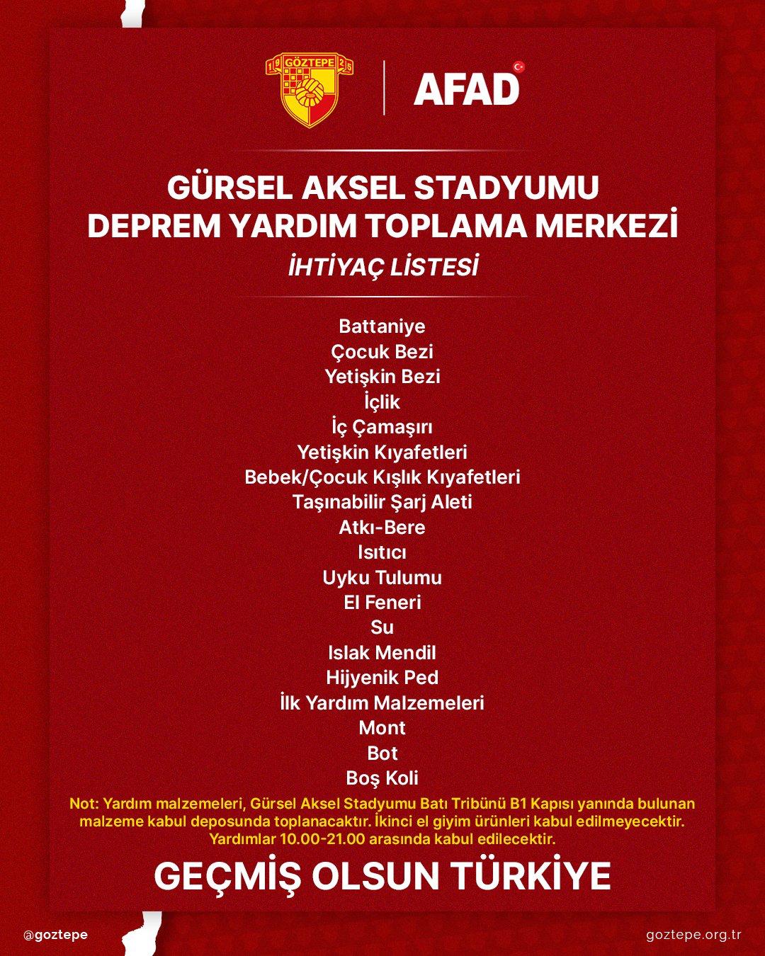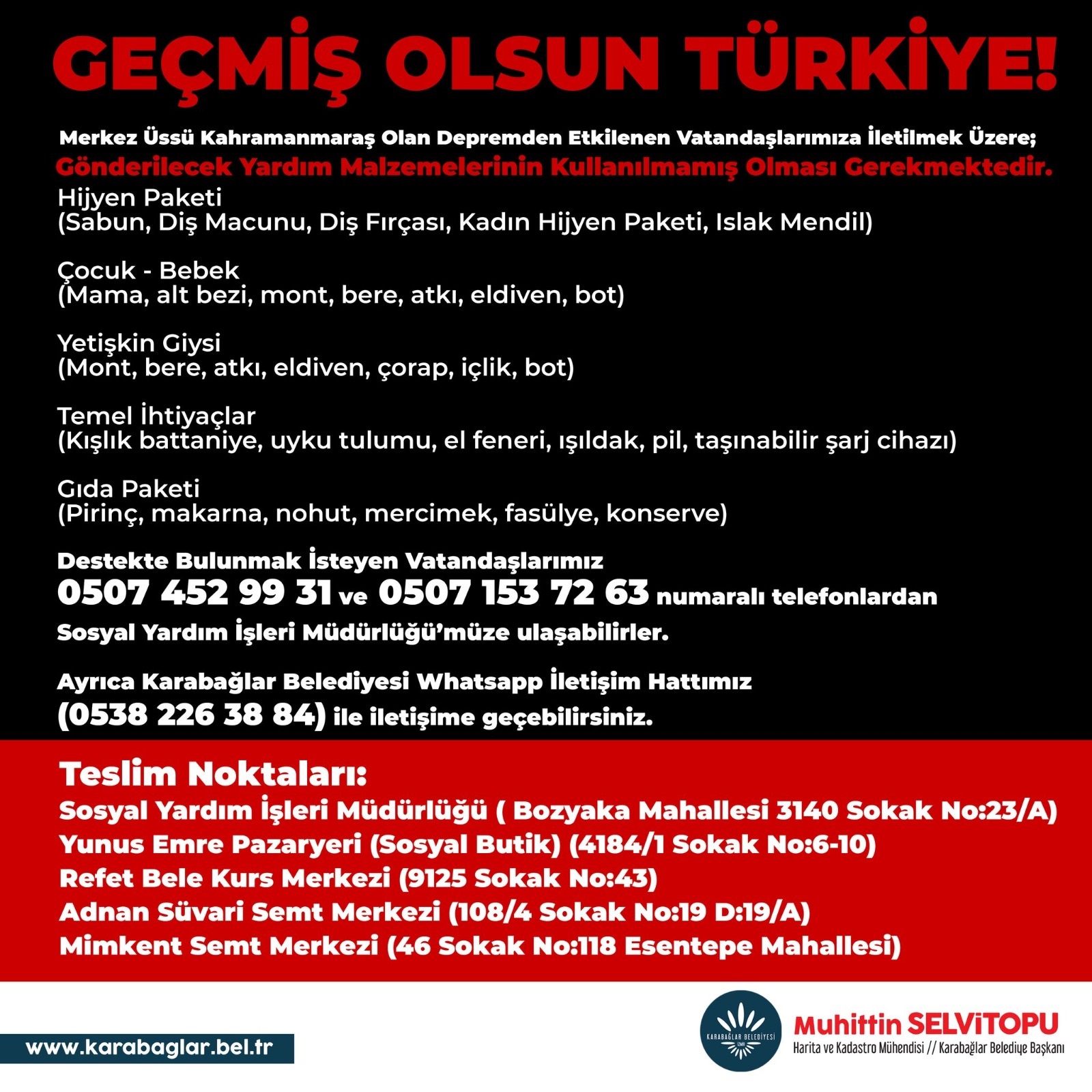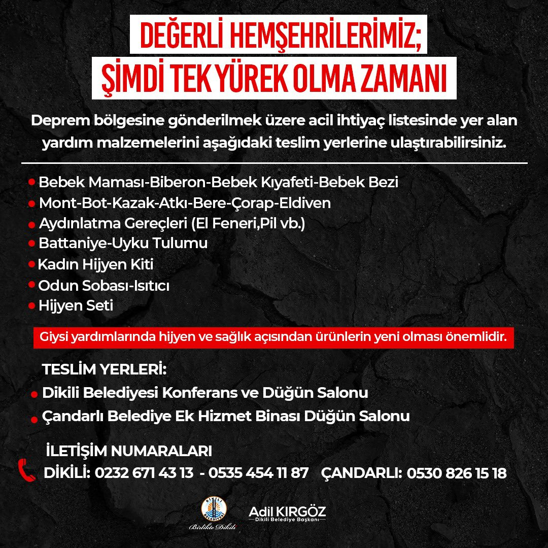 Belediye hizmet binası, Sancar Maruflu STK Yerleşkesi, Ali Rıza Bodur Eğitim Merkezi, Karşıyaka Mustafa Kemal Spor Salonu, Muharrem Candaş Spor Salonu, İsmail Cem Kültür Merkezi, Kemal Anadol Mah Mkz (Mustafa Kemal Mahallesi) yardım malzemeleri kabul edilecektir. 444 1 575