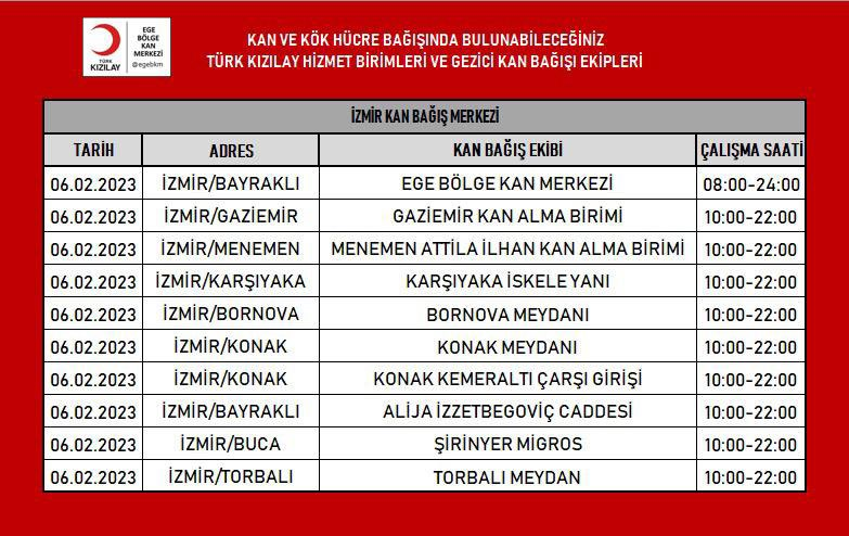 Deprem bölgesinde, ihtiyaç halinde kullanılmak üzere Kızılay Bayraklı, Gaziemir, Menemen, Karşıyaka, Bornova, Konak, Buca ve Torbalı'da 10 noktada gezici ekipleri kan bağışları toplayacak. Gezici araçlar saat 10:00 ile 22:00 arasında kan bağışlarını kabul edecek.