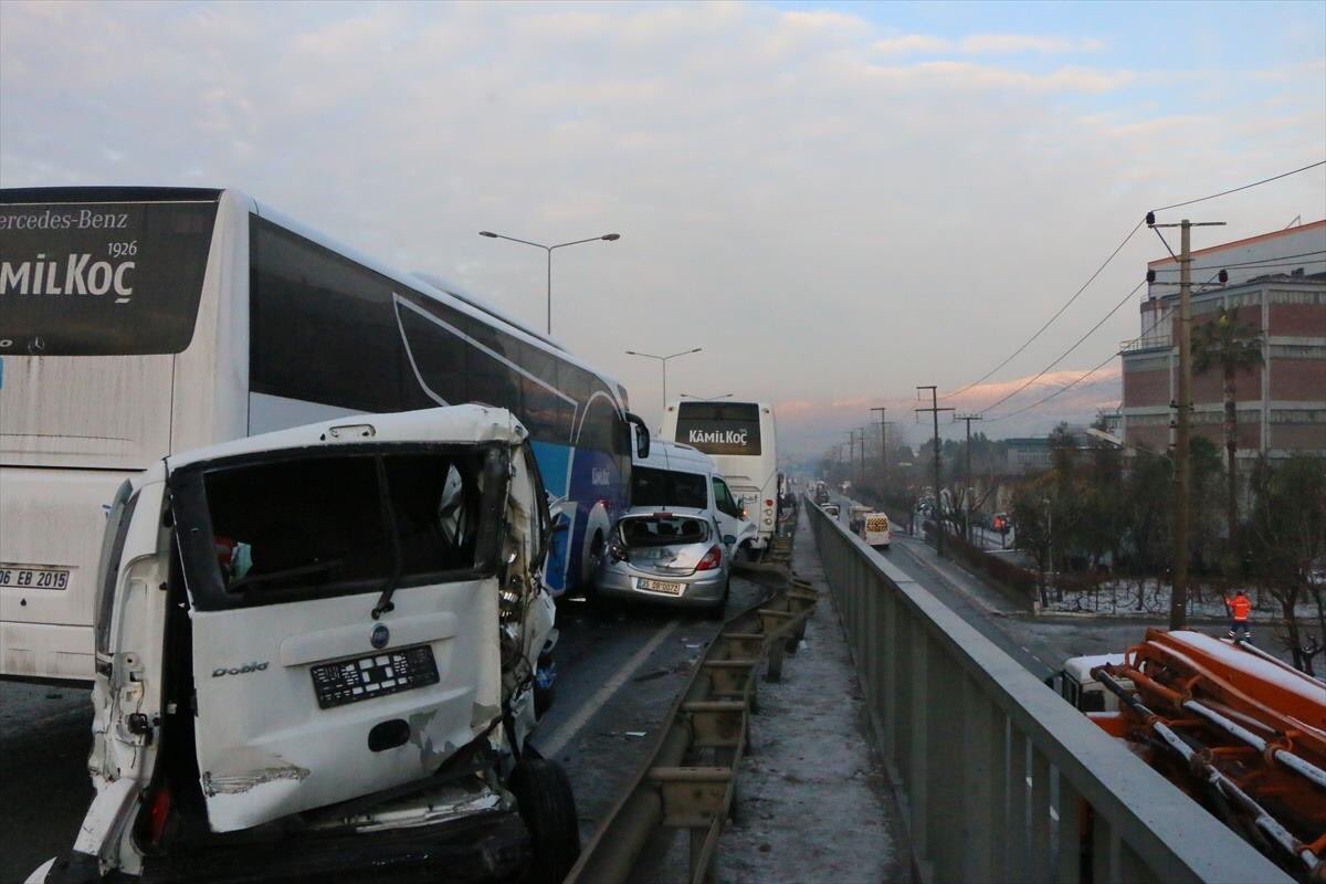 Ankara Caddesi'nde yoldaki buzlanma nedeniyle 4'ü yolcu otobüsü, biri askeri araç, kamyon, kamyonet, minibüs ve otomobilin de yer aldığı 20 araç kayarak birbirine çarptı.