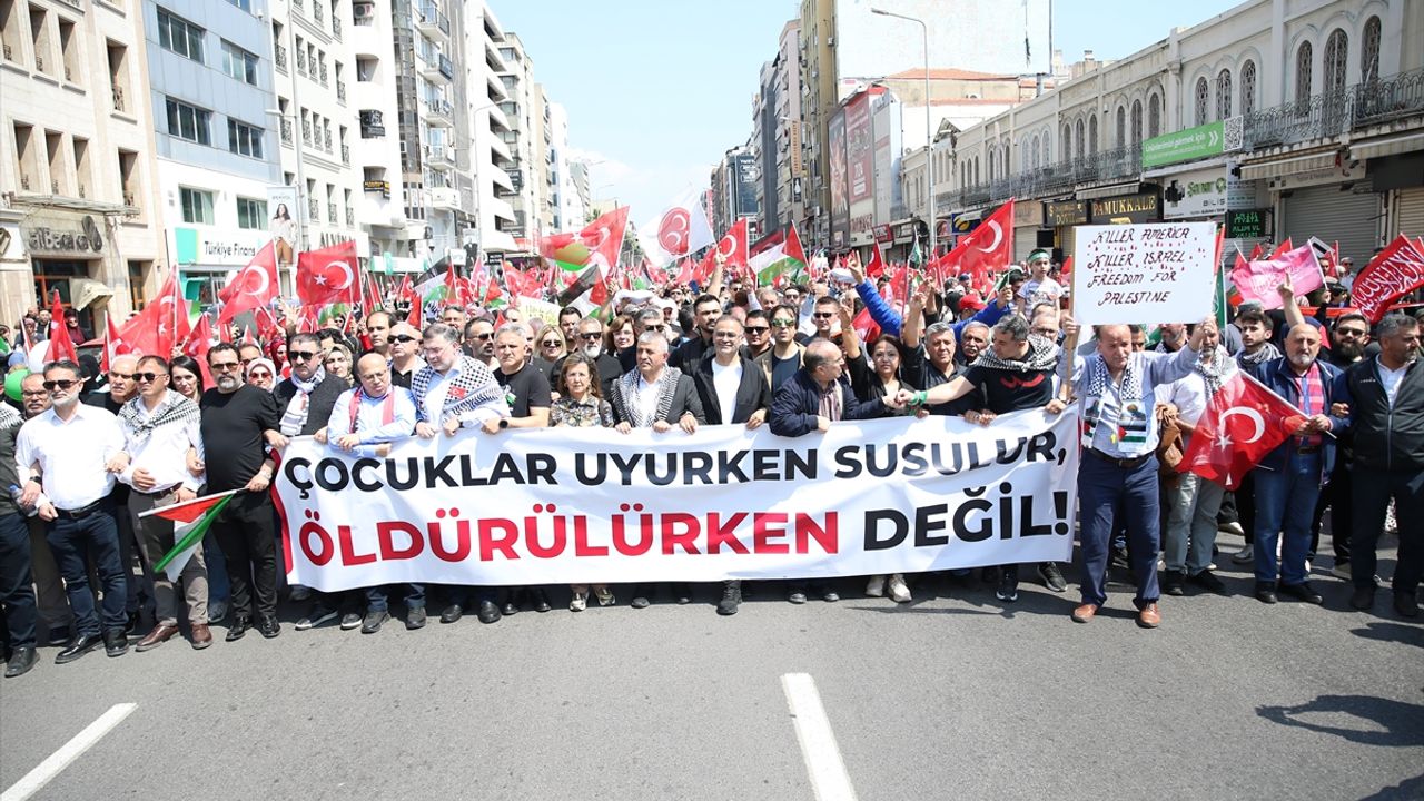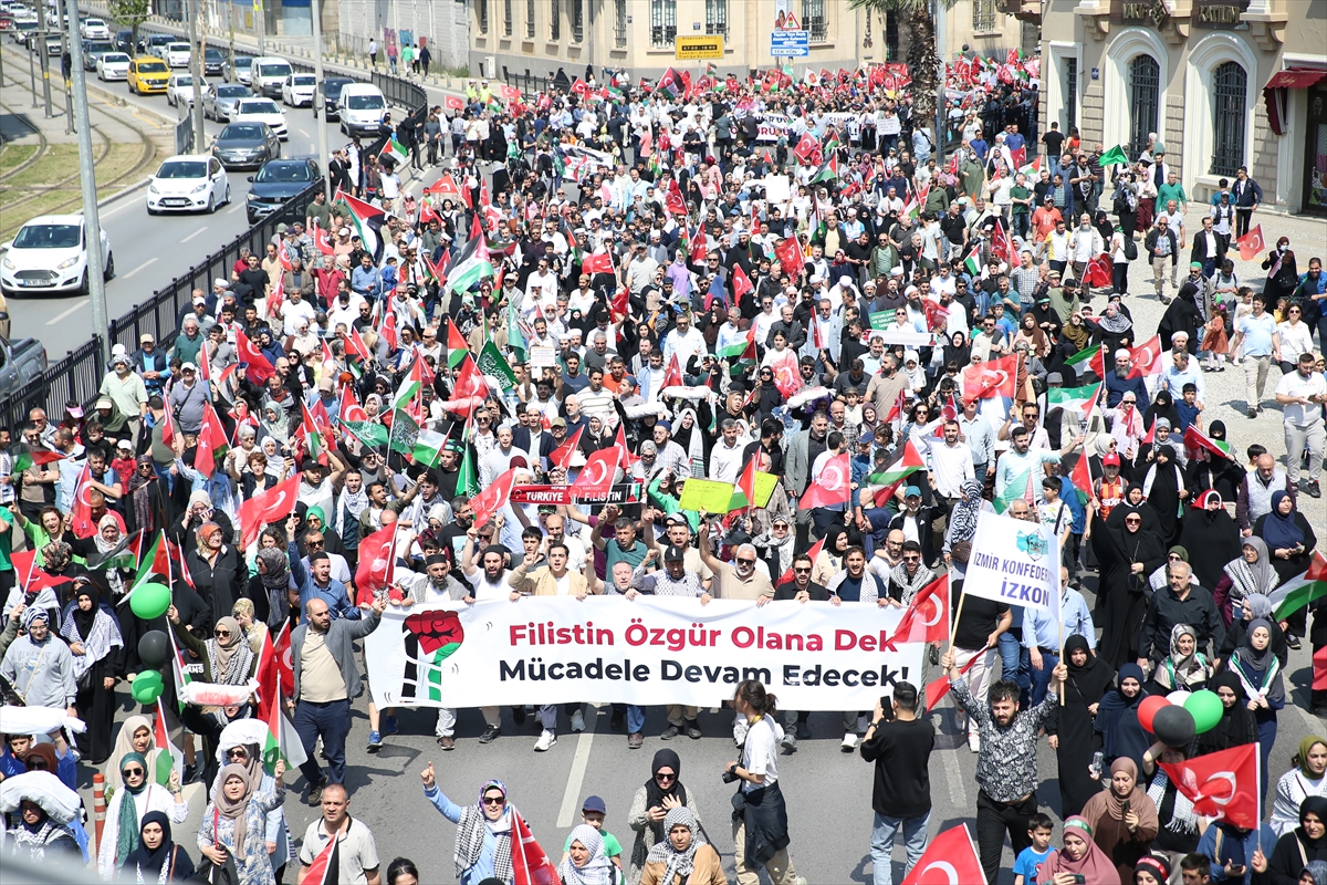 Basmane Meydanı'nda toplanan çok sayıda kişi, ellerinde Türk ve Filistin bayraklarıyla, üzerinde İsrail aleyhine ifadelerin yer aldığı döviz ve pankartlarla yürüyüşe geçti.
