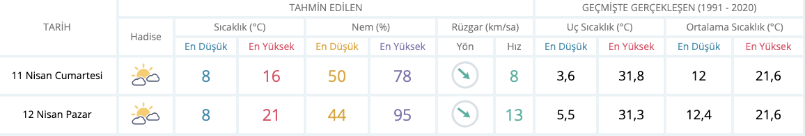 Sıcaklıklar ise mevsim normallerinde olurken 16 ile 21 derece arasında değişim gösterecek. Nem oranı ise en yüksek yüzde 95 olarak görülecek.