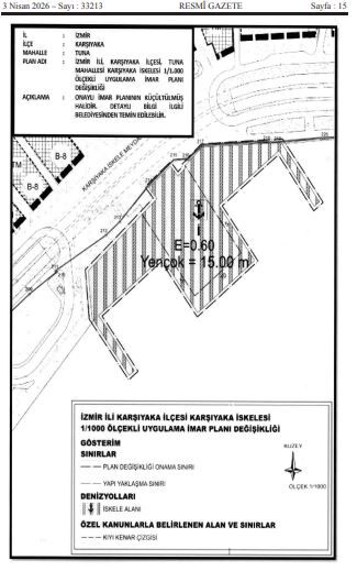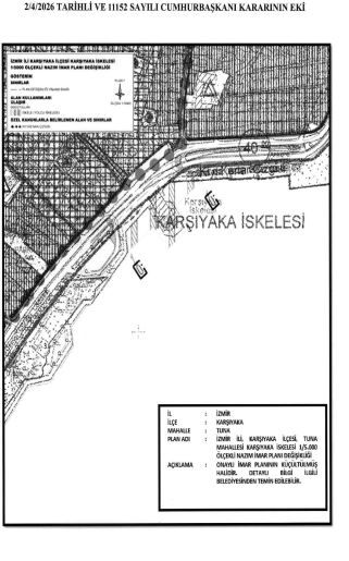 Karar 11152 ile ise Karşıyaka ilçesi Tuna Mahallesi’nde bulunan Karşıyaka İskelesi için benzer bir adım atıldı. Söz konusu alan “iskele alanı” olarak belirlenirken emsal 0.60, yükseklik ise en çok 3 kat olarak karara bağlandı. Bu düzenleme de Nazım ve Uygulama İmar Planı değişiklikleriyle yürürlüğe girdi.