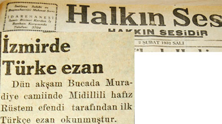Peki, cumhuriyetin öncü kenti İzmir; ezan dilinin Türkçe olmasını nasıl karşılamıştı? Cumhuriyetin her atılımında ona büyük destek veren İzmir halkı Türkçe ezanın İstanbul'dan sonra ilk kez kentin camilerinden okunması için seferber oldu. Çok ilginç bir şekilde İzmir'de ilk Türkçe ezan Buca'da okundu. Buca'ya gerek Balkan savaşları sonrasında, gerekse Kurtuluş Savaşı sonrasında mübadiller yerleştirilmişti. İşte Buca'da ilk Türkçe ezanı okuyan'da Midillili bir mübadil olan Hafız Rüstem Efendi'ydi. Midillili Hafız Rüstem Efendi ezan İstanbul'da Türkçe okunduktan 3 gün sonra Buca'da önceleri Agios İoannis kilisesi olarak bilinen ve cumhuriyetin ilk yıllarında camiye dönüştürülen ve şimdi Hasan Ağa Bahçesinin yanında bulunan Muradiye Camiinde ilk Türkçe ezanı okumuştu. İzmir basını bu olayı geniş puntolarla okurlarına duyurmayı ihmal etmemişti.