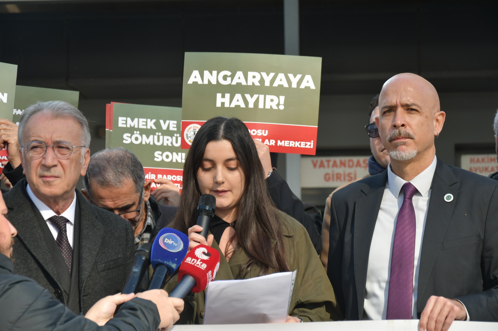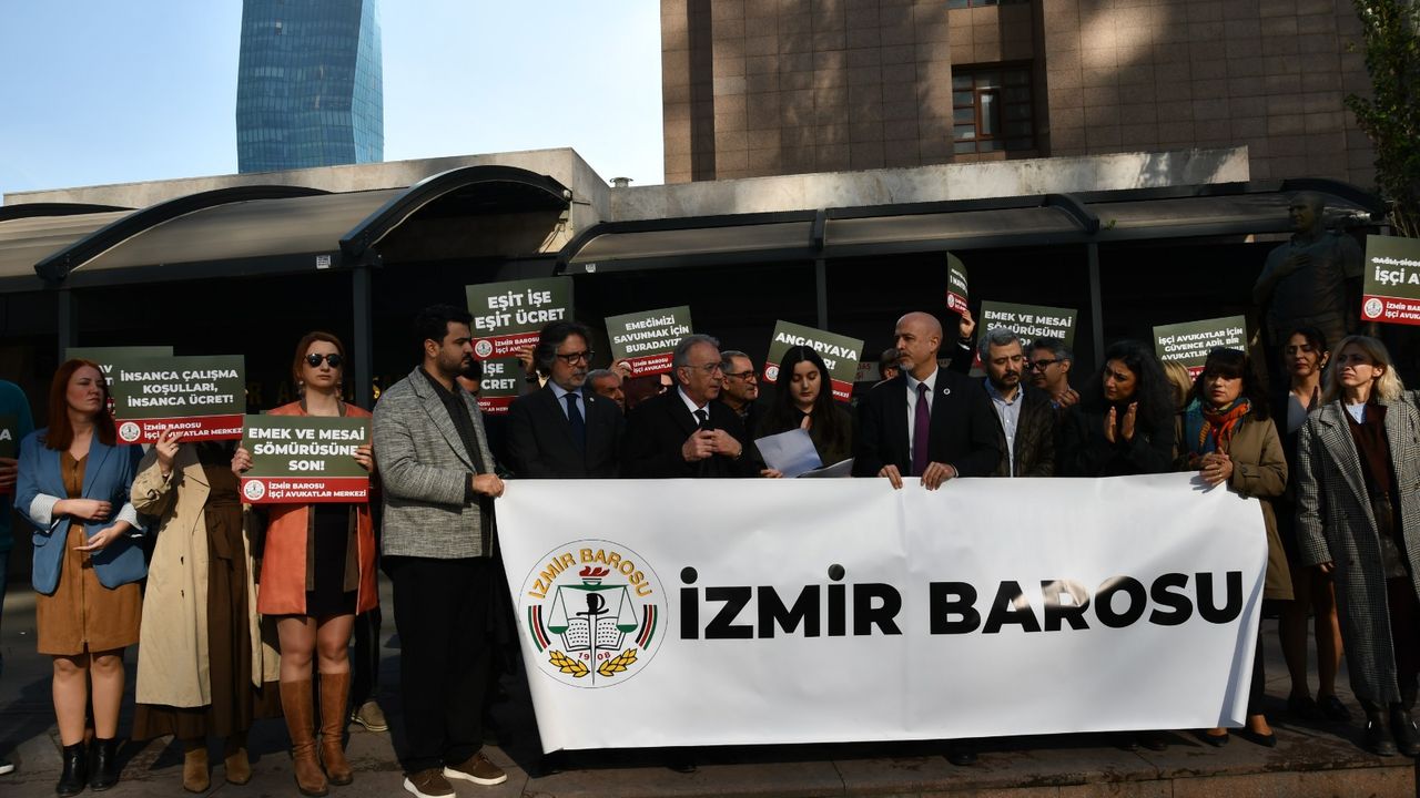 Açıklamada konuşan İzmir Barosu Başkanı Av. Sefa Yılmaz da "Ülkemizin son dönemde geçirdiği çok ağır ekonomik koşullar ve bu koşulların yarattığı sıkıntıların en çok yansıdığı mesleklerden biri belki de en çok yansıyanı avukatlık mesleği. Ve avukatlık mesleğinde de en çok emeği ile çabası ile üretimi ile çalışması ile genç meslektaşlarımız ve bağımlı çalışan işçi avukatlar. Bugün burada meslektaşımız Av. Ezgi Yağmur Tokatlı işçi avukatlar adına yaşanan sorunlar ve bu sorunlarla ilgili bilgileri bizlerle paylaşacaklar. Hep söylüyoruz ülkemizde hukuksuzluk artık her alanda var. Hukuki şiddeti yaşadığımız gibi ekonomik şiddeti de son dönemde inanılmaz boyutlarda yaşıyoruz ve bundan en çok etkilenen de işçi avukatlar. Ekonomik şiddetin özellikle kapitalizmin bu vahşi doğasında bizlere yansımasının ne kadar olumsuz olduğunu anlatmaya kelimeler yetmez. Fiziksel şiddetin sözel şiddetin hukuki şiddetin ve ekonomik şiddetin en çok etkilediği meslek olan avukatlık mesleğinin sorunlar aslında anlatmakla bitmez. Bunlarla ilgili açıklamalarımız birçok defa birçok alanda yaptık. Ama ne yazık ki bu alanda söylenen şeyler sanki bir duvara çarpıp bize döner gibi, sanki söylenmemiş gibi sanki gündeme taşınmamış gibi yok sayılmaya devam ediyor. İşte işçi avukatlar, bağımlı çalışan meslektaşlarla ilgili başlattığımız en azından bu sorunun görünür kılınması, gündeme olmasını sağlamak adına bir imza kampanyası başlattık. Adliyelerin değişik birimlerinde bu imza kampanyasını meslektaşlarımızın imzasına açtık. Buralarda yapacağımız açıklamalar ve aldığımız imzalar ilgili makamlara yeniden bildirilecek.” dedi.