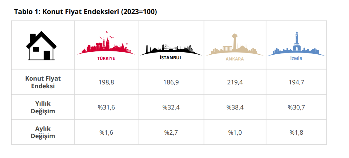 Yıllık artışta ise Ankara yüzde 38,4 ile ilk sırada yer alırken; İstanbul yüzde 32,4, İzmir ise yüzde 30,7 ile üçüncü sırada yer aldı.