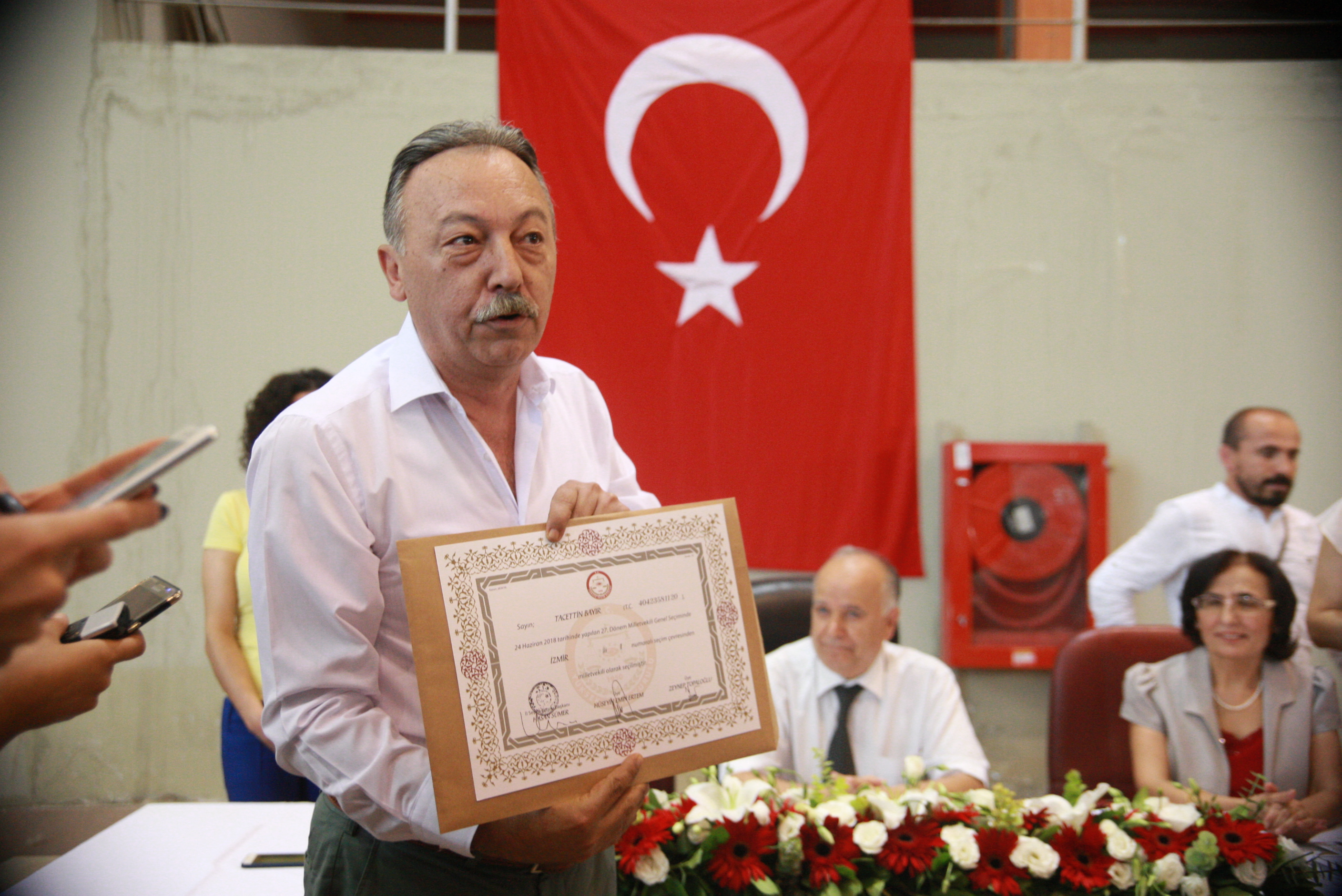 İzmir'in yeni milletvekili Mehmet Ali Çelebi, mazbatasını eşi ve çocuğuyla birlikte aldı. Kısa bir açıklama yapan Çelebi, 'Umudu dirençle devam ettirmeyi sürdüreceğiz' dedi.