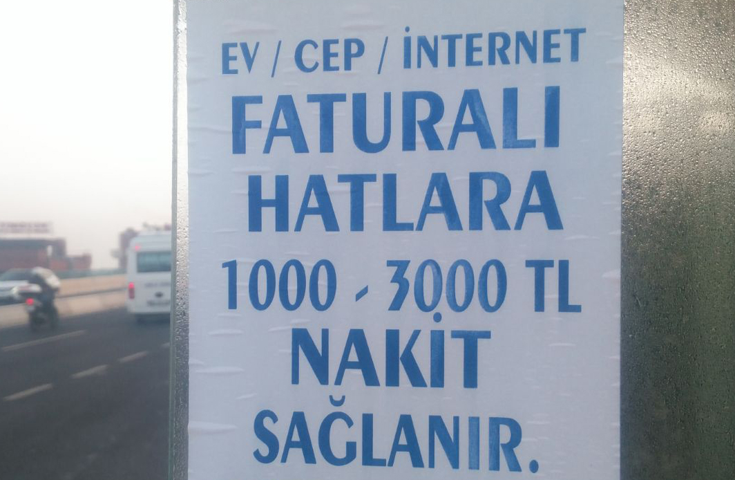 EGEDESONSÖZ- İzmir Çankaya Elektronikçiler Çarşısı'nda bazı cep telefonu toptancıları tarafından otobüs durağı, İZBAN ve metro gibi yerlerde 'Ev, cep ve İnternet faturalı hatlara 1000-3000 TL arası nakit sağlanır' şeklinde ilanlar asıldı. Vatandaşlara kullandıkları ev, cep veya internet hatlı faturalarından nakit para vaadinde bulunarak borçlanmanın yolu açılıyor.