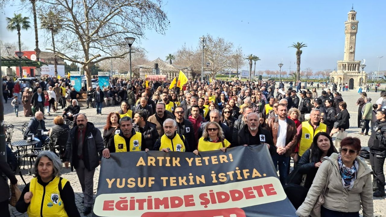 Basın açıklamasını okuyan Eğitim-Sen İzmir Şube Başkanı Hamdi Çalık ,“Yalnızca aramızdan koparılan arkadaşımız için değil, yıllardır göz ardı edilen itibarımız ve can güvenliğimiz için toplandık” dedi. Yaralanan öğretmen ve öğrenciye acil şifalar dileyen Çalık, “Bu saldırı münferit değildir. Okullarda artan şiddet vakaları uzun süredir ciddi bir tehdit oluşturmaktadır” ifadelerini kullandı. Milli Eğitim Bakanlığı’nın gerekli önlemleri almadığını savunan Çalık, “Yaptığımız uyarıları dikkate almayarak kalıcı ve önleyici politikalar hayata geçirmeyen Milli Eğitim Bakanlığı bu olayın birinci derecede sorumlusudur” diye konuştu.