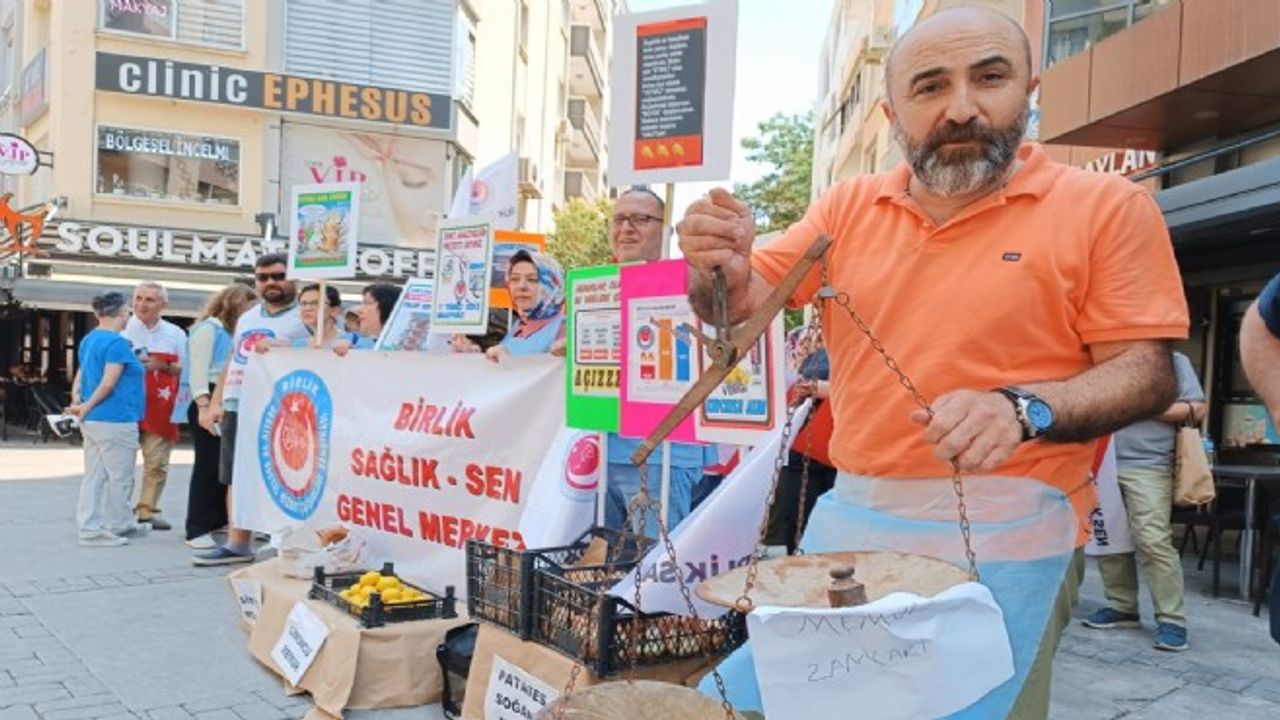 Kıbrıs Şehitleri Caddesi'nde bulunan Türkan Saylan Kongre Merkezi önünde eylem yapan sağlık çalışanları, ellerinde terazi, patates, soğan ve simitlerle basın açıklaması düzenledi.