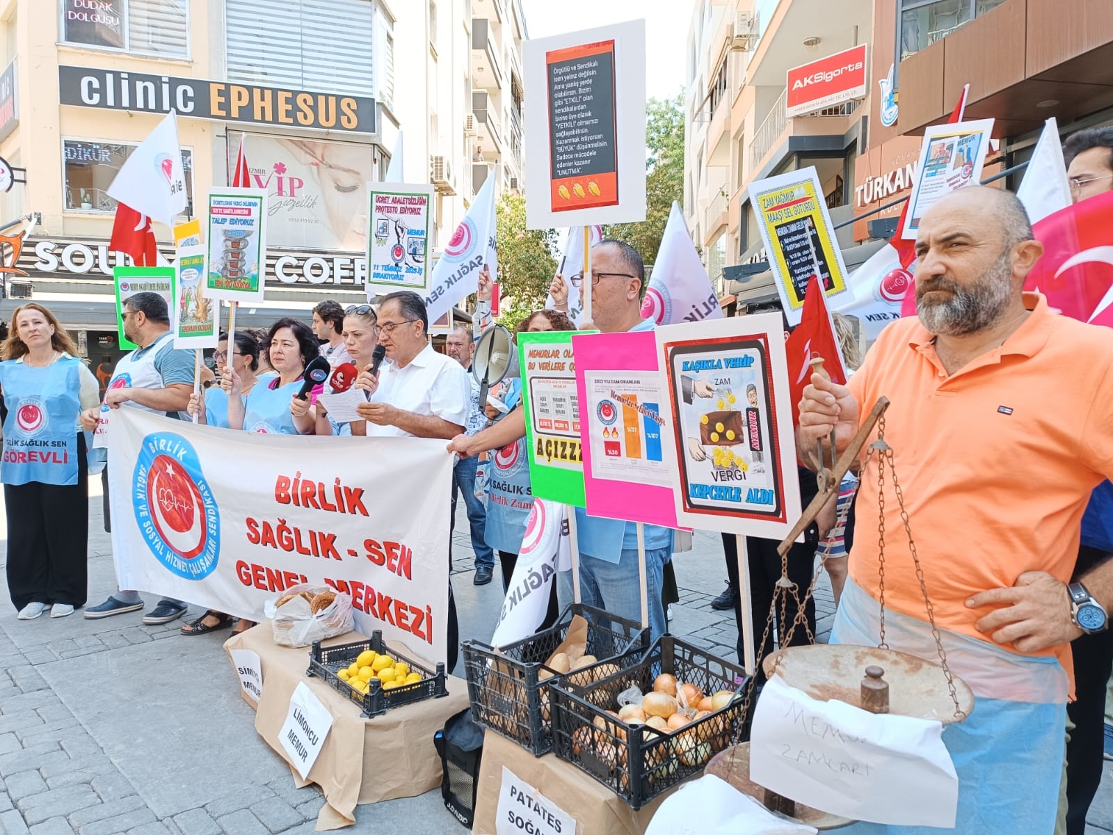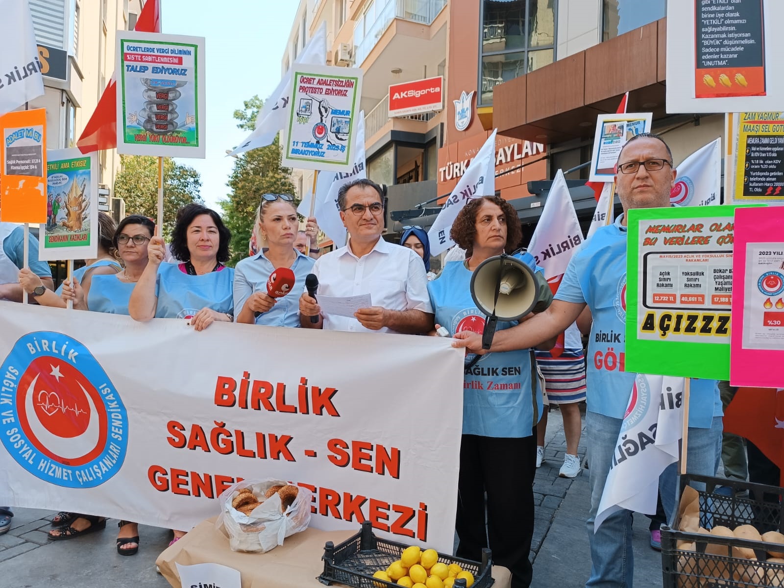 Ahmet Can KARATAŞ/EGEDESONSÖZ- Birlik Sağlık Sen üyesi sağlık çalışanları, memurlara yapılan zamları protesto etti.
