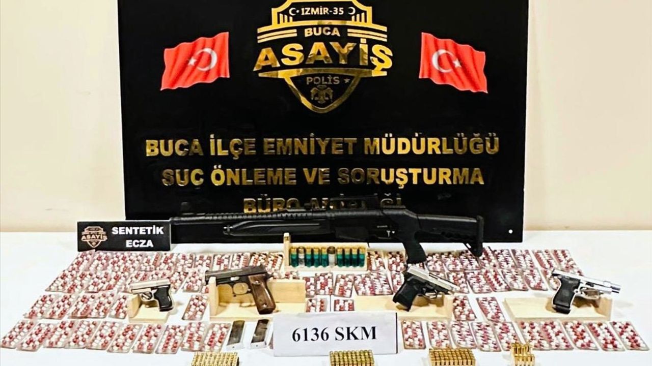 Aramalarda 4 ruhsatsız tabanca, pompalı tüfek ve bu silahlara ait 204 fişek ile 1173 sentetik uyuşturucu hap ele geçirildi.