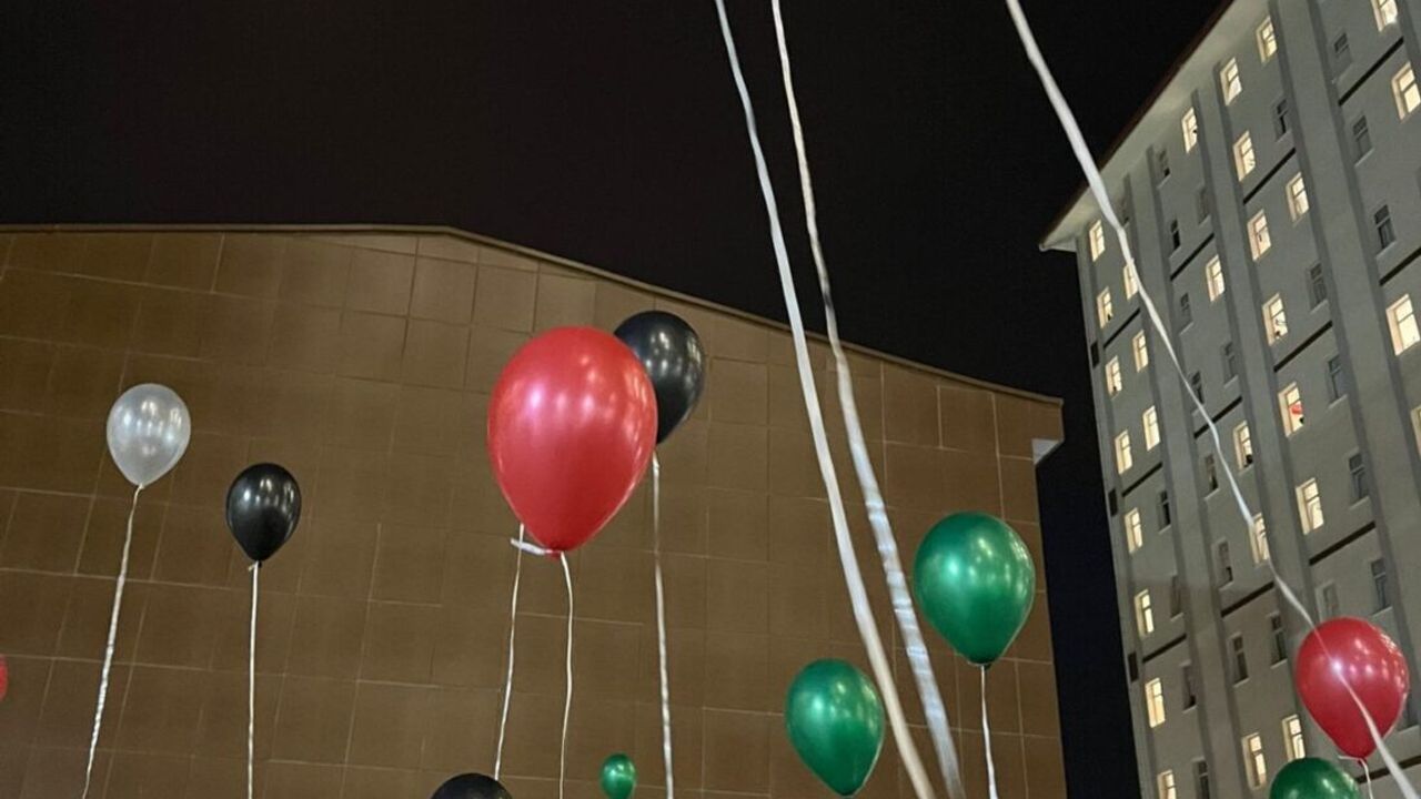 Öğrenciler, şarkılar eşliğinde Filistin bayrağının renkleri olan beyaz, kırmızı, siyah ve yeşil balonları gökyüzüne uçurdu.