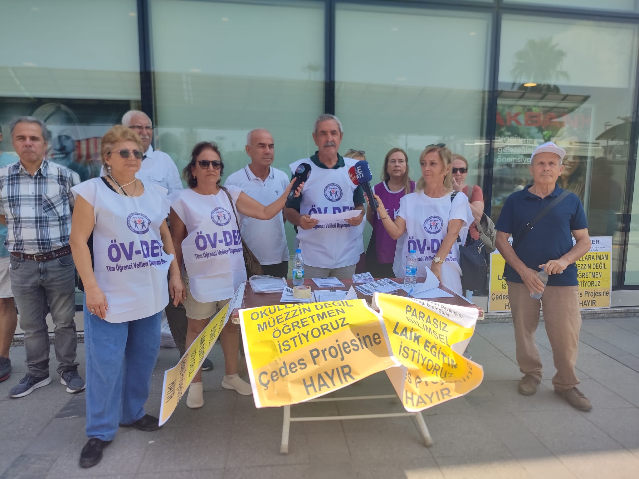 Diren ÇELİK/EGEDESONSÖZ- Milli Eğitim Bakanlığı (MEB), Gençlik ve Spor Bakanlığı ile Diyanet İşleri Başkanlığı iş birliğinde hayata geçirilen 'Çevreme Duyarlıyım, Değerlerime Sahip Çıkıyorum (ÇEDES)' projesi kapsamında okullara 'manevi danışman'' adı altında; imam, müezzin, vaiz, din hizmetleri uzmanı ve kuran kursu öğreticisi atanmasına tepkiler sürerken projenin iptali için 16 Eylül'de İzmir'de yapılacak miting öncesi Tüm Öğrenci Veliler Dayanışma Derneği (Öv-Der), Konak Meydanı'na stant açarak vatandaştan imza topladı.