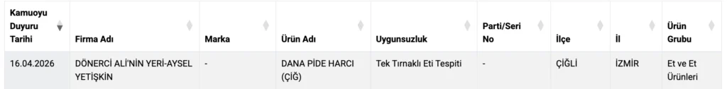 Tarım ve Orman Bakanlığı’nın 16 Nisan 2026 tarihli tağşiş listesine göre İzmir Çiğli’de faaliyet gösteren Dönerci Ali'nin Yeri adlı işletmeye ait dana pide harcında tek tırnaklı hayvan eti tespit edildi.