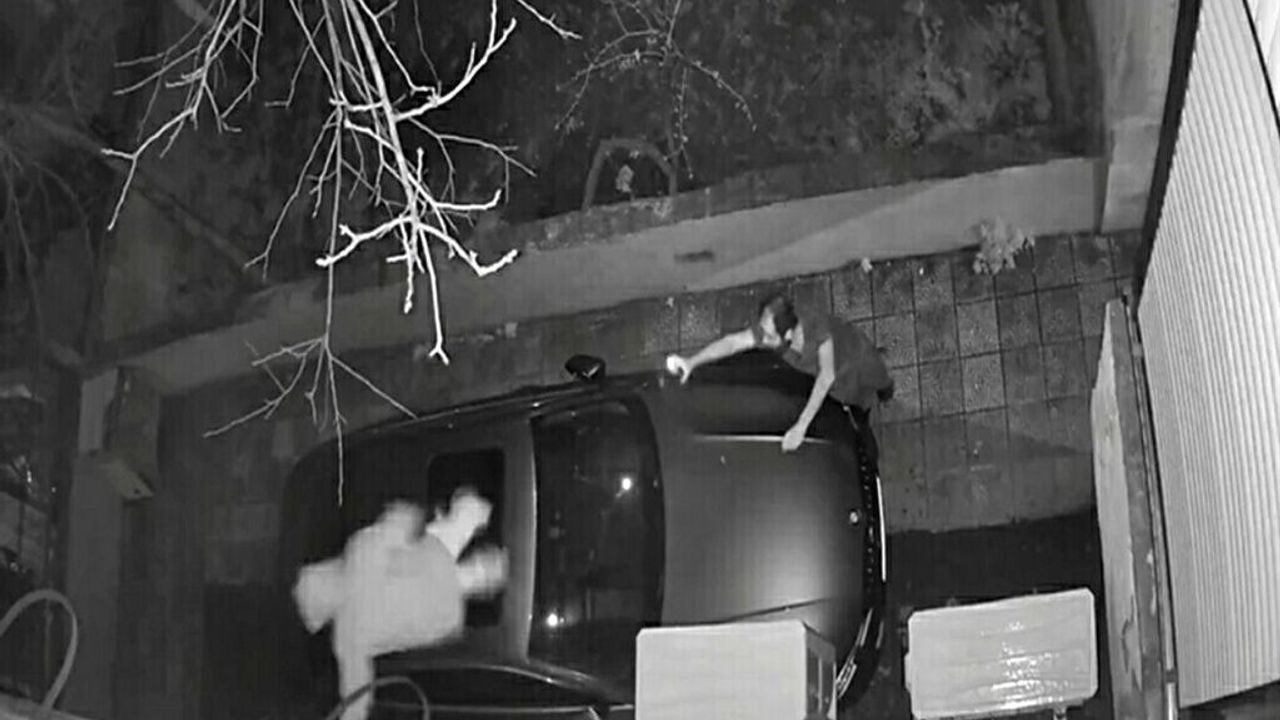 Olay, 29 Mart Pazar günü saat 21.00 sıralarında Dicle Mahallesi 363 Sokak’ta meydana geldi. Hırsızlık amacıyla 4 katlı binanın giriş katındaki iş yerinin penceresinde bulunan demir korkuluklara basan O.Ç. (33), birinci kattaki klimanın üzerine tırmandı. Bu sırada binada oturan Onur D., güvenlik kamerasından durumu fark edip, eline aldığı fenerle bahçeye koştu. Onur D., şüpheliye bağırarak aşağıya inmesini istedi. Ancak, şüpheli park halinde duran aracın üzerine atladı. Daha sonra otomobilde kendisini bekleyen arkadaşı F.K. (37) ile bölgeden uzaklaştı. Olay anı ise binanın güvenlik kamerasına yansıdı.