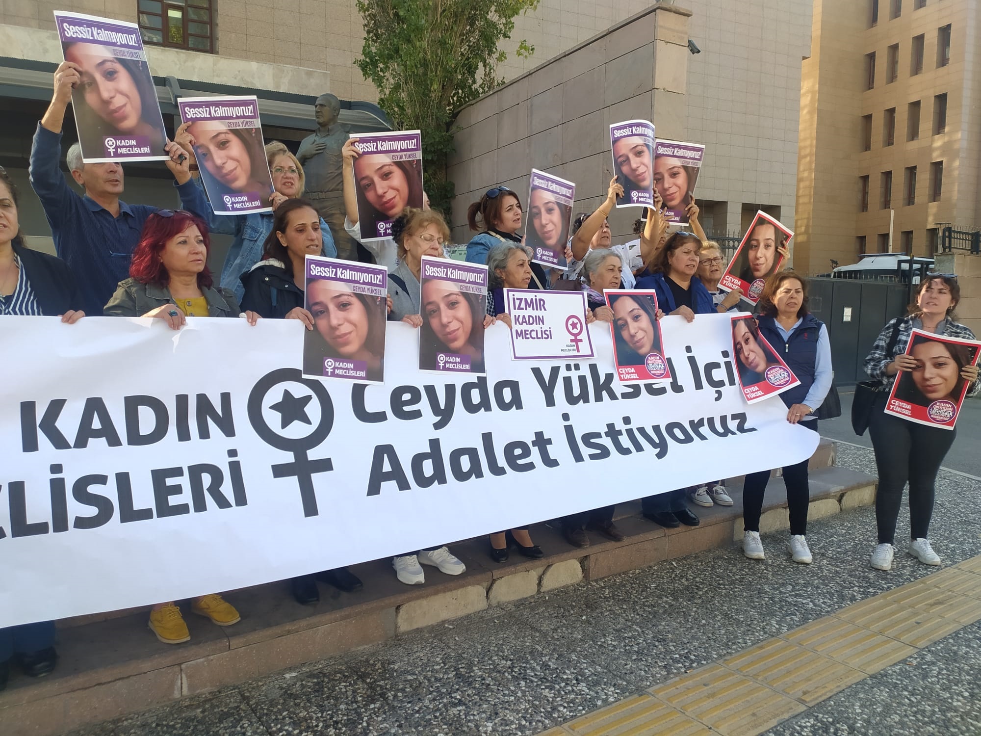 Mahkeme öncesinde Kadın Cinayetlerini Durduracağız Platformu Kadın Meclisleri ve Karabağlar Kent Konseyi Kadın Meclisi üyeleri adliye kapısı önünde eylemdeydi. Yapılan açıklamada 'Ceyda Yüksel ve öldürülen tüm kadınlar için adalet sağlansın. Kadın katilleri emsal olabilecek şekilde en üst sınırdan cezalandırılsın, İstanbul Sözleşmesi ve 6284 etkin uygulansın. Ezgi ve Hülya defalarca uzaklaştırma kararı aldırmalarına rağmen öldürüldüler. Yasalar etkin uygulansaydı aramızda olabilirlerdi' denildi.