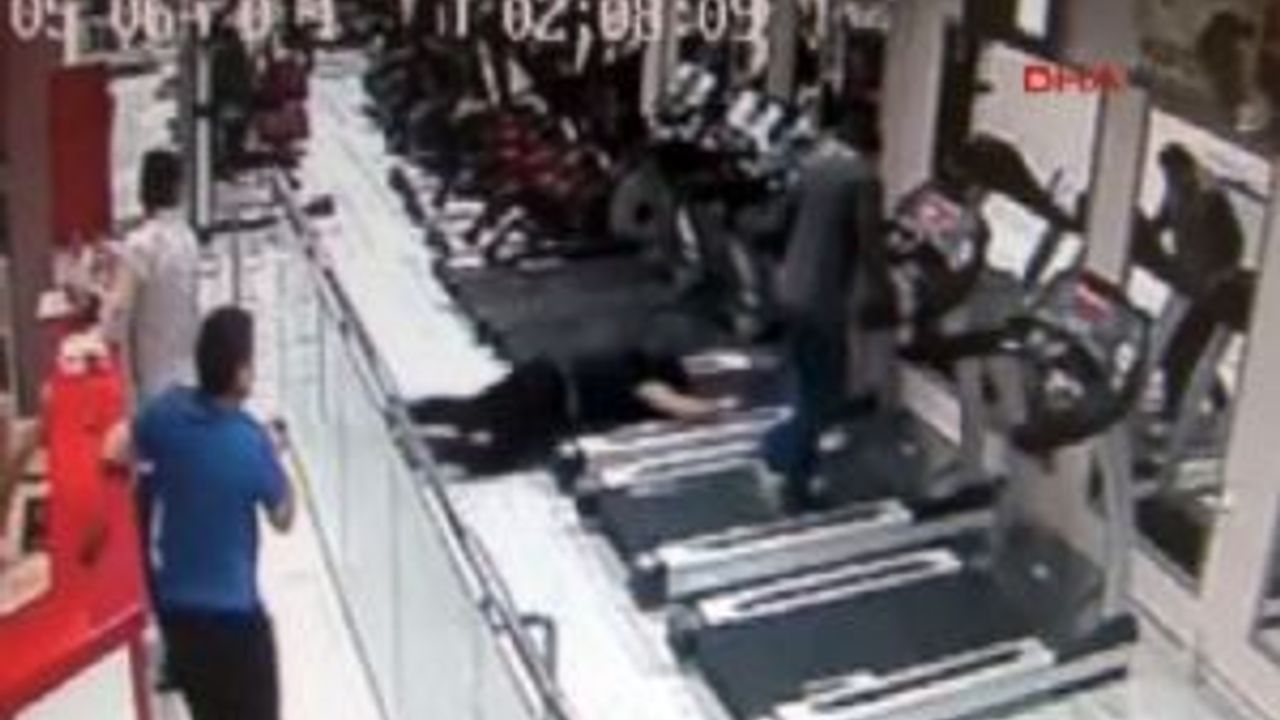 Görüntüde Çam'ın spor yaptığı koşu bandından yürüyüş yaparken yere yığıldığı görülüyor.