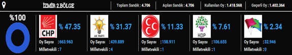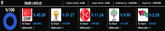 1 Kasım seçimlerinde İzmir'de tüm ilçelerde CHP ile AK Parti ilk iki sırayı alırken, partilerin en çok oy aldıkları ilçeler de belli oldu. CHP 156 bin 610'le en fazla oyu Karşıyaka'da alırken, AK Parti 107 bin 927 oyla Karabağlar'da zirve yaptı. MHP'ye Buca'dan 38 bin 332 oy çıkarken, HDP de Karabağlar'da 31 bin 423 oy aldı.
