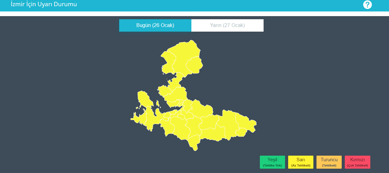Beklenen olumsuz hava koşulları nedeniyle Meteoroloji Genel Müdürlüğü tarafından İzmir genelinde sarı kodlu uyarı yayımlandı. Yapılan açıklamada uyarının merkez dâhil tüm ilçeleri kapsadığı belirtilirken; sel, su baskını, yıldırım, yerel dolu yağışı, kuvvetli rüzgâr ve ulaşımda aksamalar gibi risklere karşı dikkatli olunması istendi.
