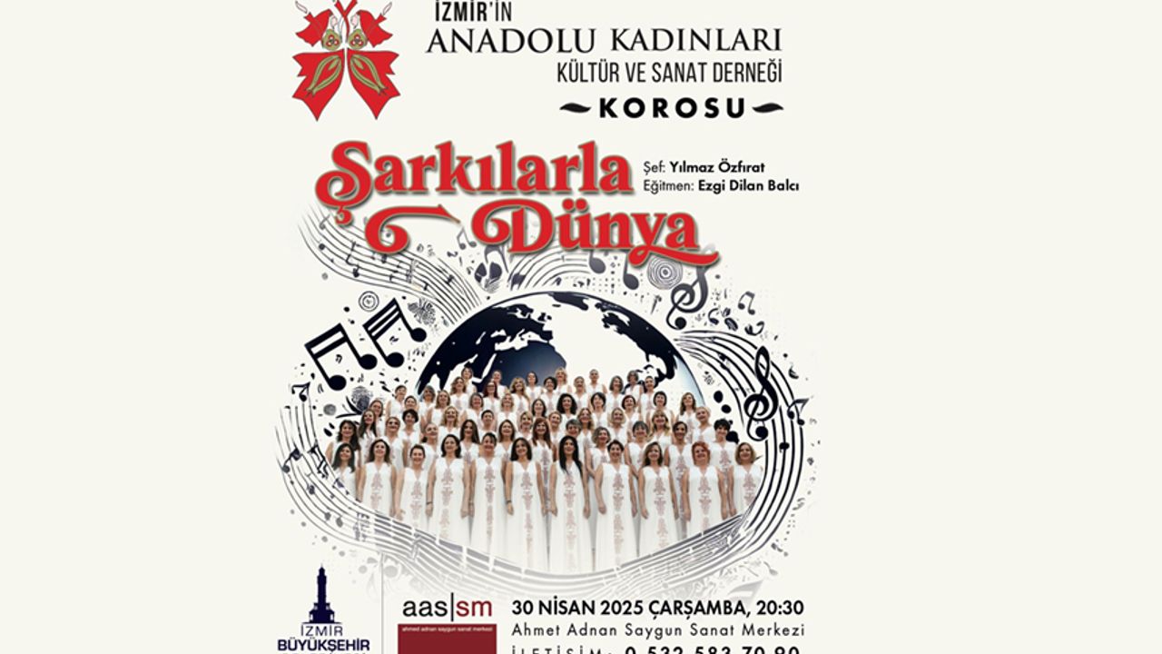 İzmir Büyükşehir Belediyesi AASSM, İzmir'in Anadolu Kadınları Kültür ve Sanat Derneği Korosu’nun “Şarkılarla Dünya” konserine ev sahipliği yapacak. 30 Nisan Çarşamba günü saat 20.30’da başlayacak konserin bağış geliri ile tıp fakültesi öğrencilerine burs sağlanacak. Yılmaz Özfırat şefliğinde verilecek konserin eğitmeni ise Ezgi Dilan Balcı olacak.