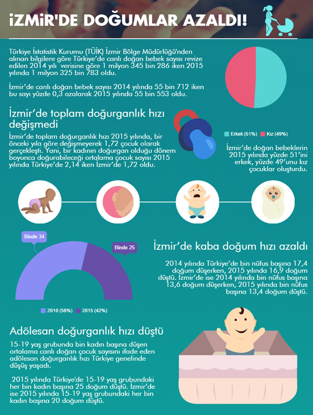 Canlı doğan bebeklerin yüzde 51'ini erkek, yüzde 49'unu kız çocuklar oluşturdu. İzmir'de ise canlı doğan bebek sayısı 2014 yılında 55 bin 712 iken bu sayı yüzde 0,3 azalarak 2015 yılında 55 bin 553 oldu. İzmir'de doğan bebeklerin 2015 yılında yüzde 51'ini erkek, yüzde 49'unu kız çocuklar oluşturdu.