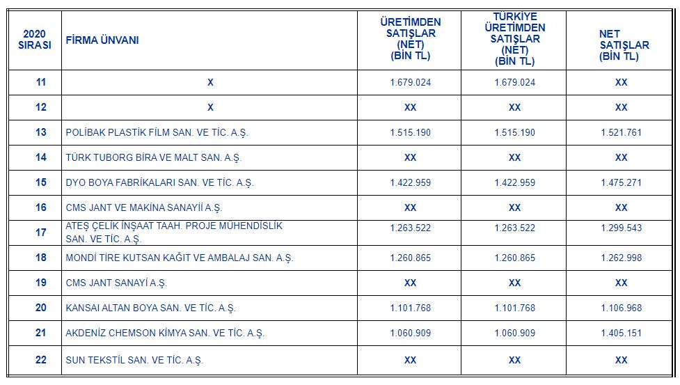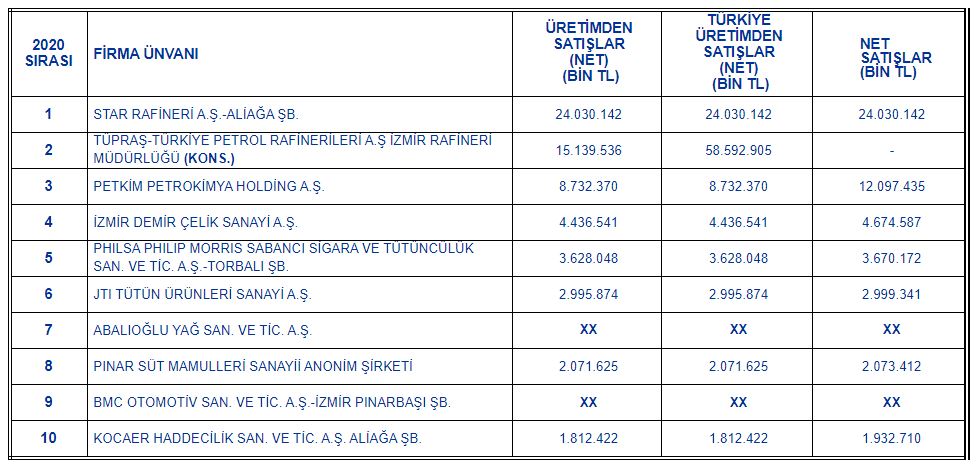 'Üretimden satışlara' göre 100 büyük sanayi kuruluşu 2020 yılı sıralamasında Star Rafineri A.Ş, 2 yıldır zirvede olan TÜPRAŞ'ın yerini alarak 1'inciliği elde etti. Star Rafineri A.Ş'ni, düşen bir üretim ve satışla; TÜPRAŞ ve PETKİM takip etti. İlk 10'da sırasıyla PETKİM'in ardından; İzmir Demir Çelik,Philsa Philip Morris, JTI Tütün, Abalıoğlu Yağ Sanayi, Pınar Süt Mamulleri, BMC Otomotiv ve Kocaer Haddecilik yer aldı.