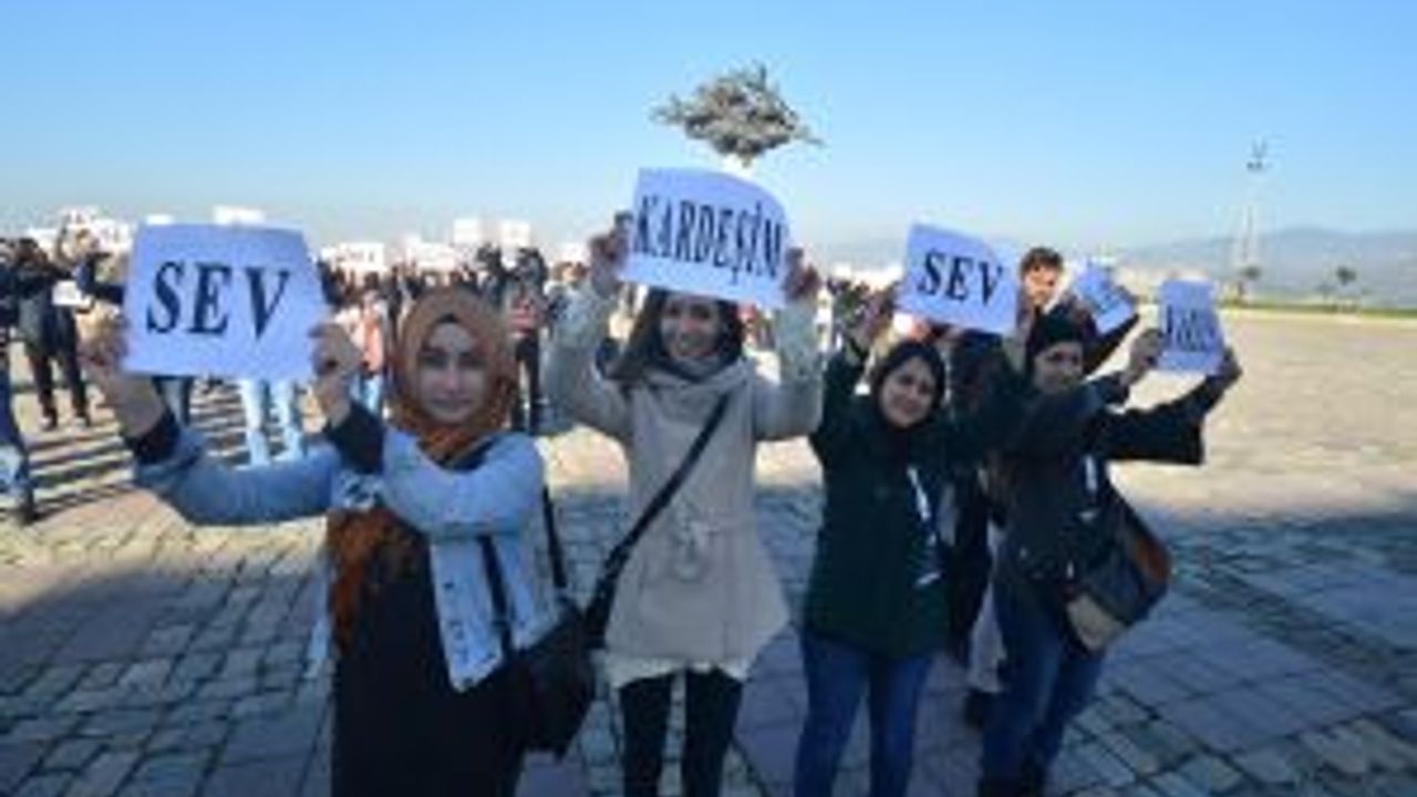 Abla-Ağabey-Kardeş, Gençler-Yaşlılar El Ele gibi toplumsal projelerin hayata geçirilmesinde önemli katkıları olan gönüllüler, Gündoğdu Meydanı'nda toplanarak 'Sev kardeşim' yazılı pankartlar açtı.