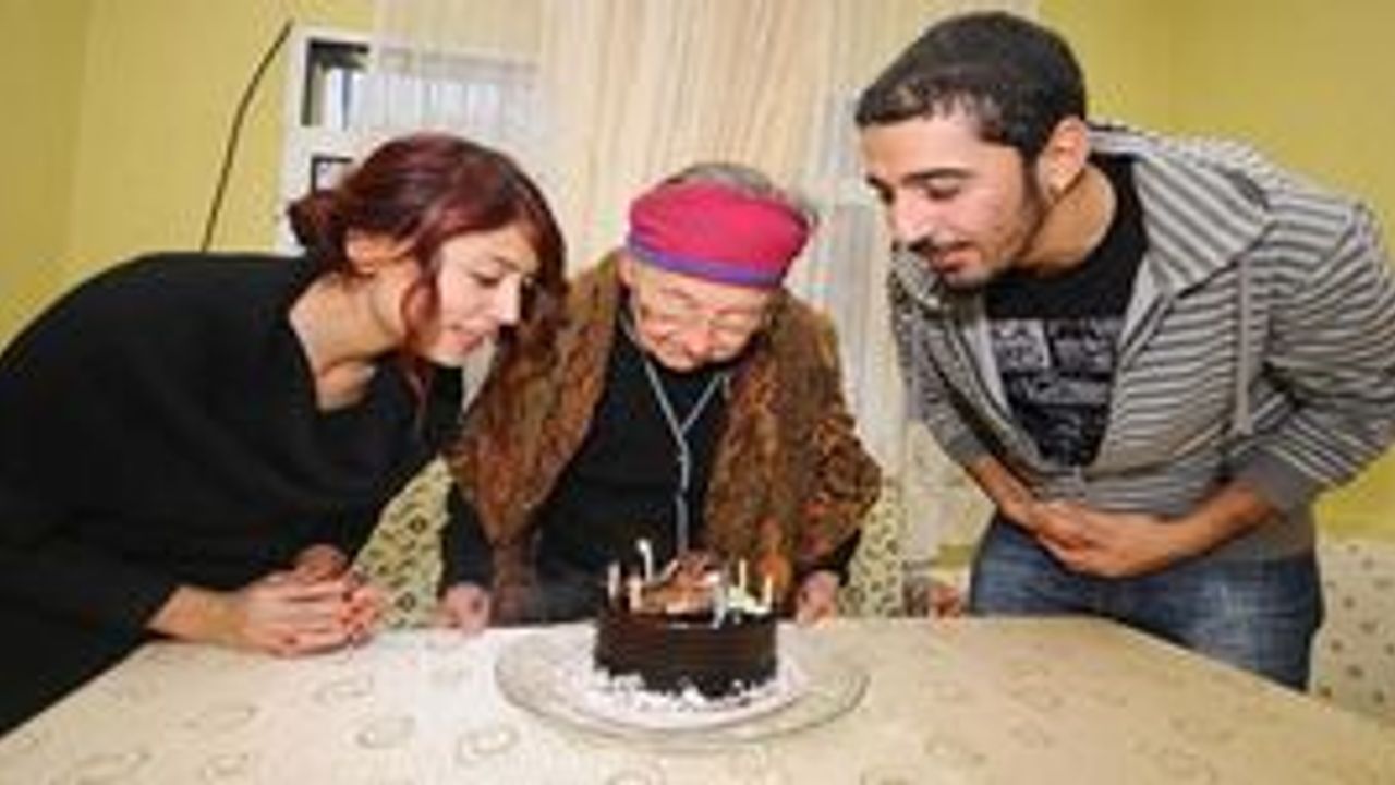 İZMİR - Büyükşehir Belediyesi’’nin ’‘Gençler-Yaşlılar Elele Projesi’’, yalnız yaşayan yaşlılarla gençleri buluşturmaya devam ediyor. Büyükşehir Belediyesi Sosyal Projeler ve Hizmetler Dairesi Başkanlığı tarafından yürütülen proje sayesinde, 80 yaşındaki Şükran Kaşkır’’la bir araya gelen Selda Erdem ve Ercan Kılıçlar adlı gençler, Kaşkır’’a hayatının en büyük sürprizini yaşattılar. Evine ziyarete gidecekleri günün Şükran Teyze’’nin doğum günü olduğunu öğrenen gençler, ona pasta ile hediye aldı.
