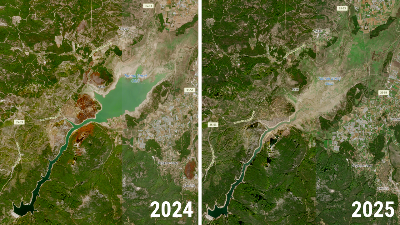 4 Kasım 2024 ve 4 Kasım 2025 tarihli uydu fotoğrafları, barajdaki değişimi gözler önüne seriyor.