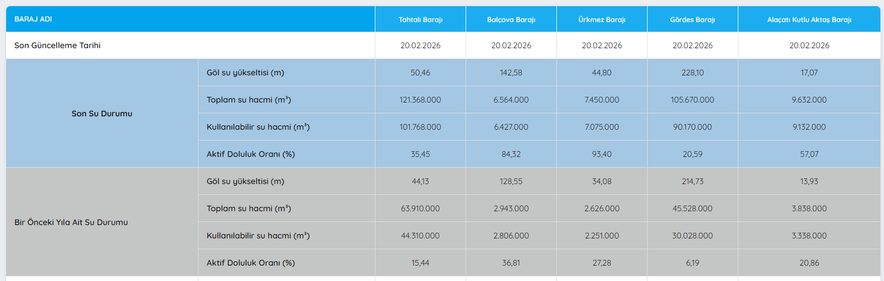 EGEDESONSÖZ- 20 Şubat 2026 tarihli verilere göre, İzmir’i besleyen barajlarda hem toplam su hacmi hem de aktif doluluk oranlarında geçen yıla kıyasla dikkat çekici bir artış yaşandı. Uzun süredir kritik seviyelerin gündemde olduğu kentte, kış yağışlarıyla birlikte su rezervlerinde önemli bir toparlanma görüldü.