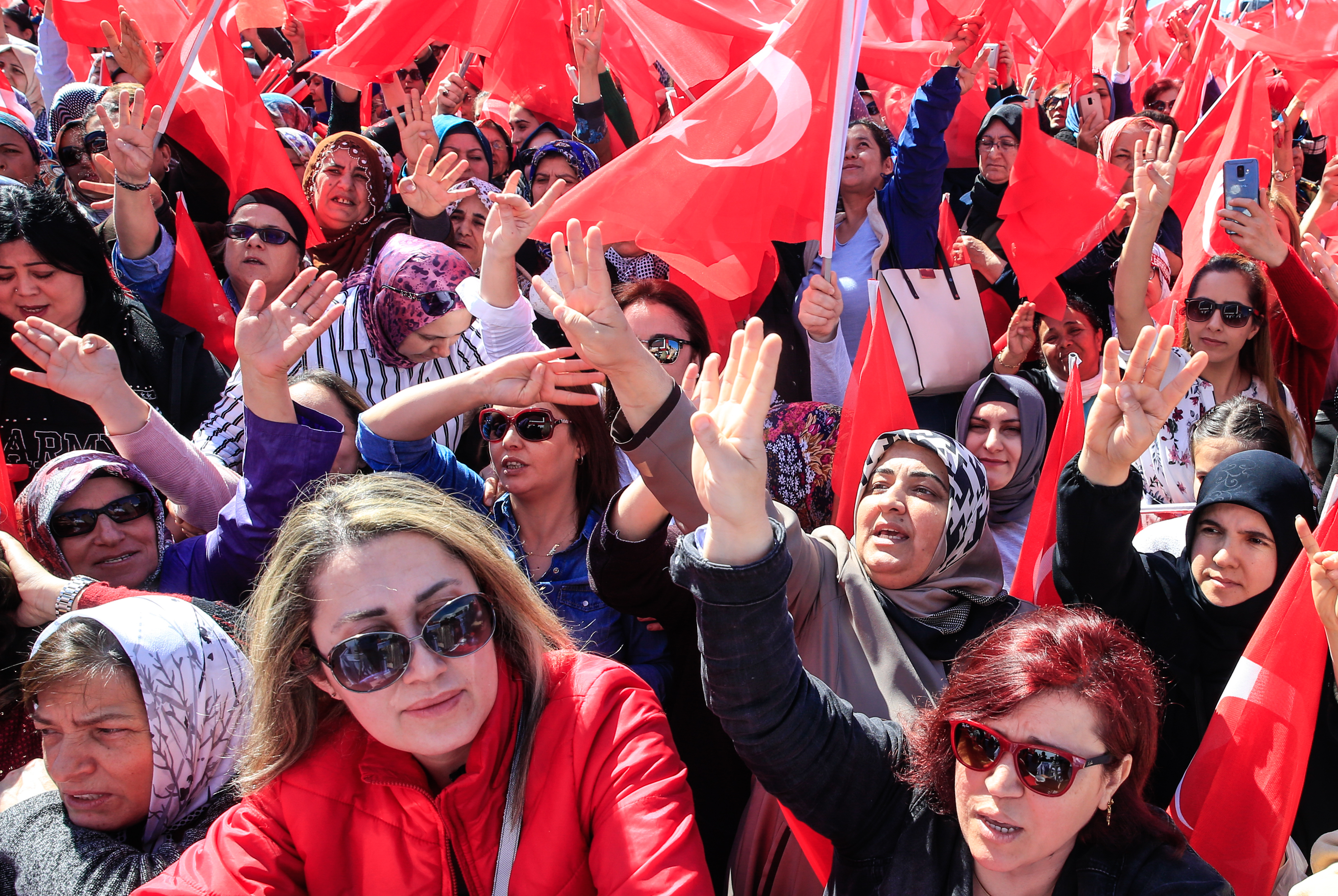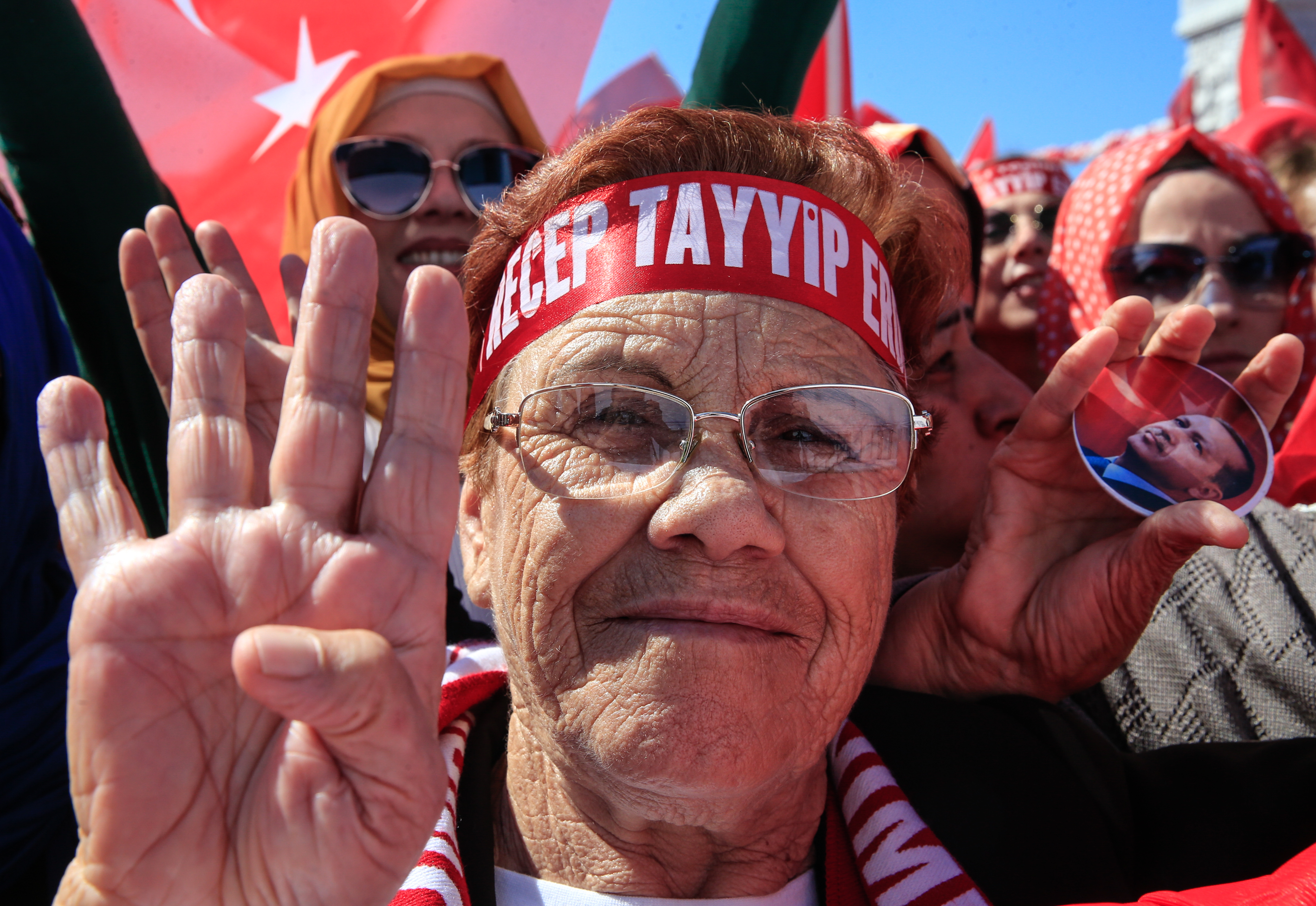 15 Temmuz gecesi CHP Genel Başkanı Kemal Kılıçdaroğlu'nun tankların arasından kaçtığını söyleyen Erdoğan, 'Bay Kemal sen ürkeksin, korkaksın, senden bir şey olmaz! Yürüyeceksin millet yürüyecek arkandan diyerek yetiştik. O gece milyonlar yürüdü. Sen korkaksın, senden bir şey olmaz. İzmir'e de böyle bir korkak ve adamı yakışmaz. İzmir'den yiğitler, mertler çıkar. 31 Mart'ta İzmir bunun hesabını soracaktır. Buna var mıyız? İzmir Yunan işgaline uğradığında da birileri ellerinde çiçeklerle düşmanı karşılamıştı. Aynı İzmir Hasan Tahsin'le kıyama kalkıp düşmanı körfeze dökmeyi bilmiştir. Karşımızdakiler bizi Türk ve Müslüman görüyorlar. Bizim ezan, bayrak, Rabia'mız konusundaki hassasiyetimizin sebebi budur' ifadelerini kullandı.