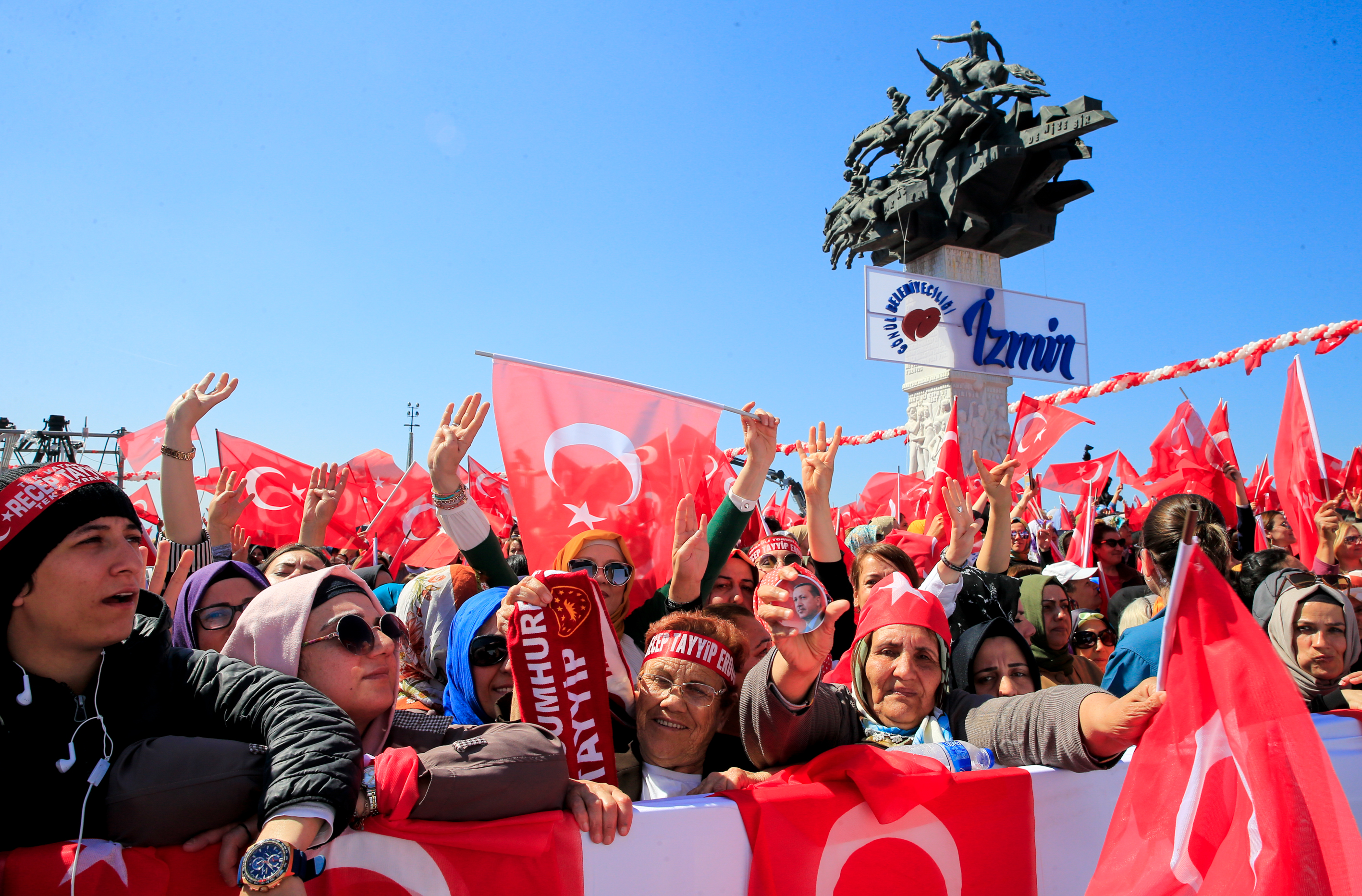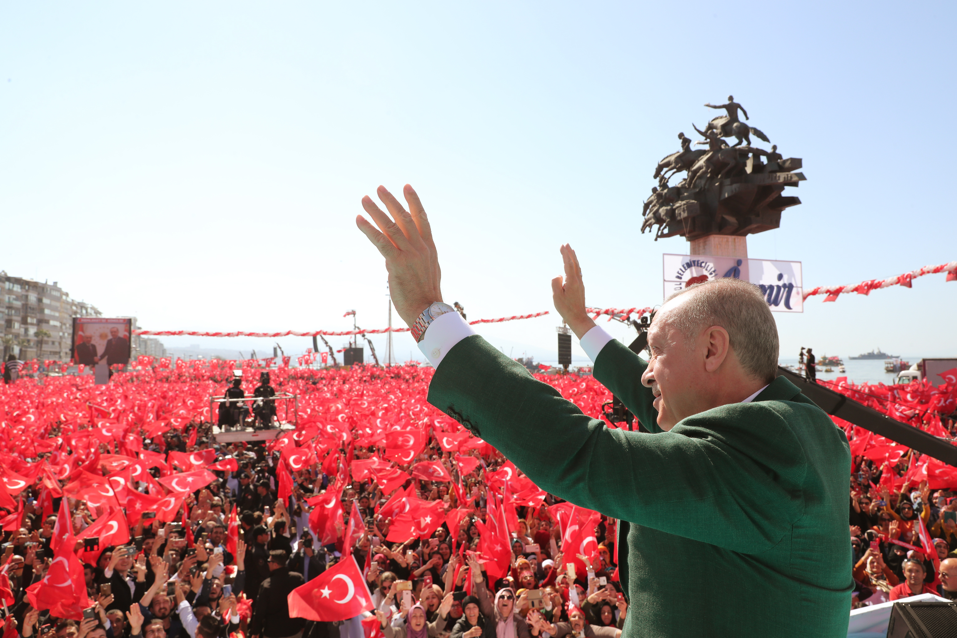 Erdoğan, 'Ben bugün İzmir'i bir başka görüyorum. Coşkusu bir başka. İzmir kararını vermiş. İzmir bu ibreyi tersine çevirecek. İzmir'i pırıl pırıl yapacağız. Sizlerin de bu matruşka oyununa bu bukelamun siyasetini 31 Mart'ta sona erdirmenizi istiyorum. Hazır mıyız? Milletin karşısına çıkmaya açıkça cesareti olmayanlara ne belediye ne ülke emanet edilmez. Atatürk'ün mirasına sahip olmayanlara dersini vereceğinize inanıyorum. İstiklalimize, istikbalimize saygısı olmayanlara derslerini bu seçimde vereceğinize inanıyorum. İzmirliler iradesini babalarının malı gibi görenlere ağızlarının payını sandıkta verecek. Benim aşkla bağlı olduğum İzmir bu!' açıklamasını yaptı.