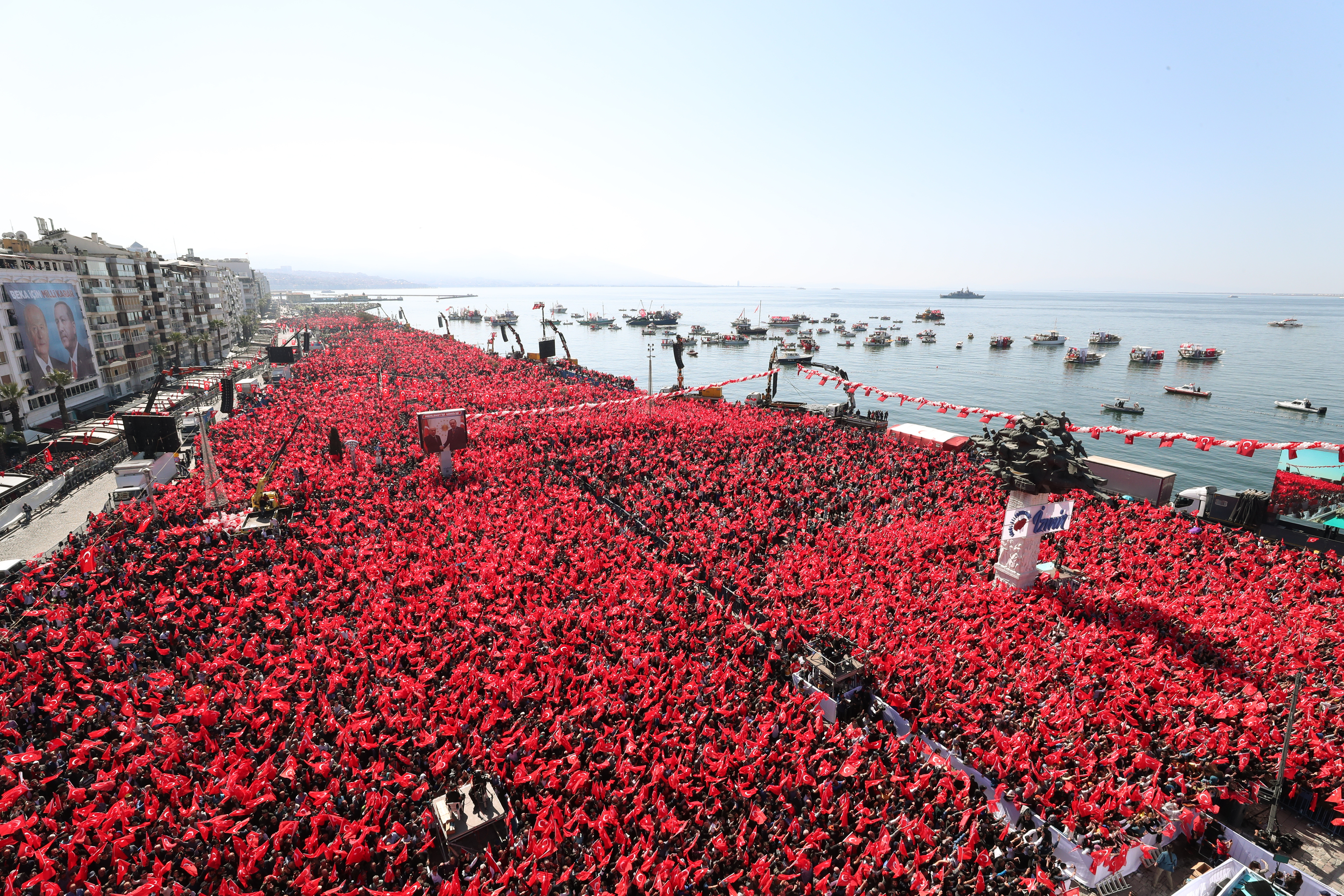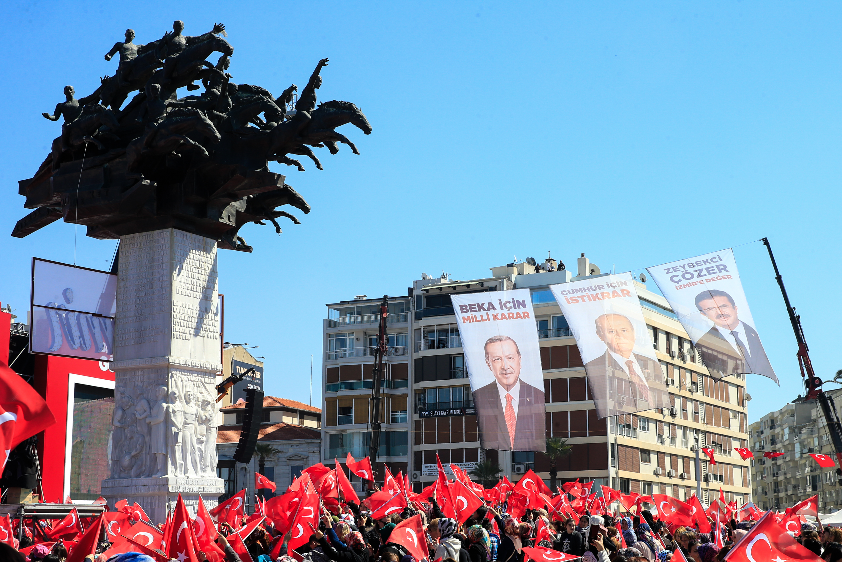 Cumhurbaşkanı ve AK Parti Genel Başkanı Recep Tayyip Erdoğan ve MHP Genel Başkanı Devlet Bahçeli Gündoğdu Meydanı'nda toplanan coşkulu kalabalığa seslendi. Mitinge bakanlar nezdinde katılım oldu. Ayrıca alanda Cumhur İttifakı'nın İzmir Büyükşehir Belediye Başkan Adayı Nihat Zeybekci, milletvekilleri, AK Parti İzmir İl Başkanı Aydın Şengül, MHP İzmir İl Başkanı Veysel Şahin, her iki partinin yöneticileri ve devlet bürokrasinin temsilcileri de yer aldı.