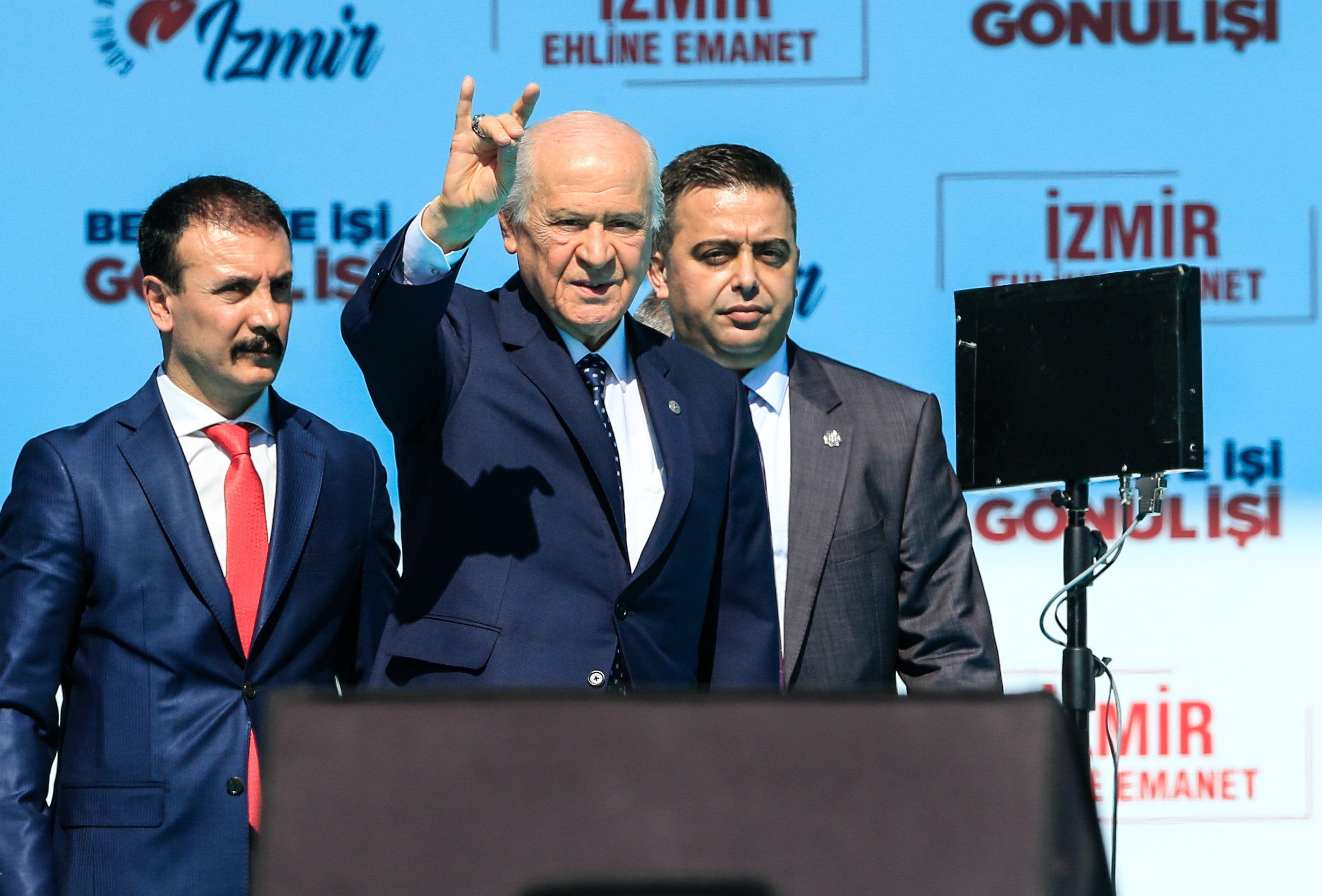 Bahçeli sözlerini sürdürürken, 'İzmir'in dağlarında çiçekler açacak, altın güneş orada sırmalar saçacak, bozulmuş düşmanlar sel gibi akacak. İzmir'i hiç kimse çantada keklik görmesin. İzmir'i hiç kimse arka bahçesi zannetmesin. İzmir'de bir şey değişecek, her şey değişecektir. Şımaranlara, yolunu şaşıranlara 12 Eylül mirasçılarına İzmir sırtını dönmeli, daha müreffeh bir yönetime, daha fazlasını yapacak bir iradeye kucağını açmalıdır. Bu irade Cumhur İttifakı'dır. Büyükşehir adayı da tecrübe ve birikimiyle öne çıkan Nihat Zeybekci'dir. Bütün başkan adaylarına başarılar diliyorum. MHP bütün gücüyle, teşkilat mensuplarıyla Cumhur İttifakı'nın başarısı için çalışacağız. Birlikte başaracağız ve İzmir ağırlıklarından kurtulacaktır' ifadelerini kullandı.