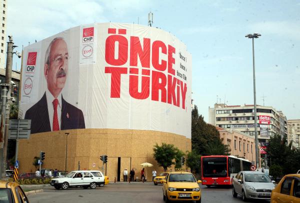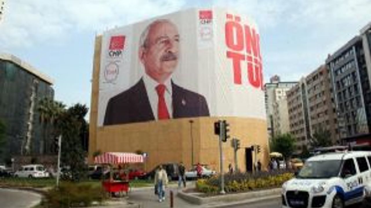 Otel binasının üç cephesi zeminden çatıya kadar Kılıçdaroğlu'nun fotoğrafı ve partinin 'Önce insan, önce birlik, önce Türkiye' yazılı seçim sloganının yer aldığı kumaş ile kaplandı.