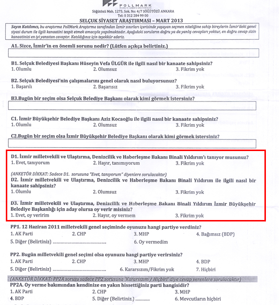 Pollmark Şirketi tarafından kentin her ilçesinde yapılan anket vatandaşlara tahmin edileceği üzere bulundukları ilçenin belediye başkanı ve belediyenin performansının yanı sıra gönlündeki başkan adayı ve doğal olarak Büyükşehir Belediye Başkanı Aziz Kocaoğlu hakkındaki kanaatlerini sorguluyor. Siyasi parti seçimlerinin de sorgulandığı anketin en dikkat çekici yönü ise Bakan Binali Yıldırım'ın İzmir adaylığını direkt nabzını tutan 3 özel soruya yer verilmiş olması…