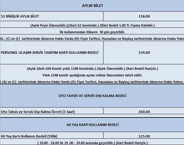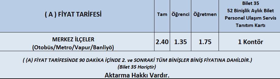 Belediye yetkilileri ilk olarak ulaşımdaki binişlere zam yapmadı. Şehir merkezi olarak nitelendirilen A kategorisinde (otobüs-metro-vapur ve banliyö) tam bileti 2.40, öğrenci 1.35, öğretmen 1.75, 35 bilet ile 52 binişlik aylık personel ulaşım servis kartından alınan 1 kontörü korudu. Bu düzenleme aynen kaldı. Sadece 35 bilet hariç tüm kategorilerde 90 dakika içinde sınırsız biniş hakkı verildi.