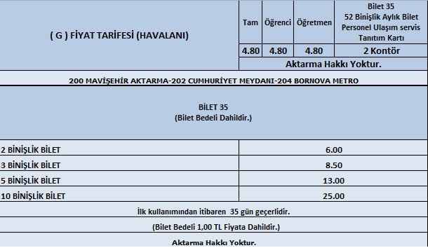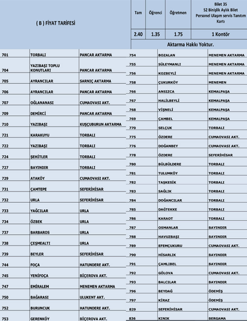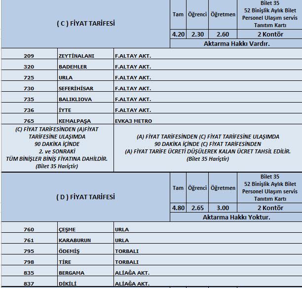 Belediye D fiyat tarifesine ise Urla, Çeşme, Tire ve Ödemiş gibi uzak ilçeleri koydu. Burada ise aktarma hakkı vermedi.