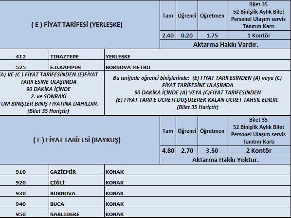 E Fiyat tarifesinde ise üniversite öğrencileri için düzenleme yapıldı. Ege ve 9 Eylül Üniversitesi öğrencileri için tarifeler arası geçiş ücreti değişmedi.