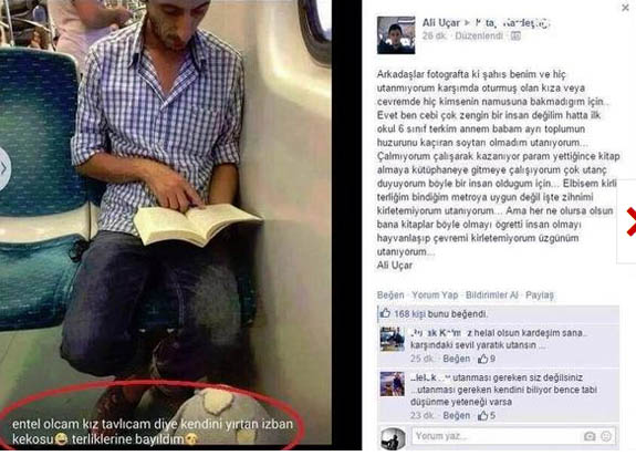 Ali'nin fotoğrafını çekip paylaşan kişi, onun kitap okumasına gönderme yaparak: 'Entel olcam, kız tavlıcam diye kendini yırtan İZBAN kekosu terliklerine bayıldım' notuyla paylaştı. Uçar bu paylaşıma kendi Facebook hesabından ''Arkadaşlar fotoğraftaki kişi benim ve hiç utanmıyorum karşımda oturan kızın namusuna bakmadığım için... Ben cebi çok zengin biri değilim hatta ilkokul altı terkim, annem babam ayrı ama ben toplumun huzurunu kaçıran bir serseri olmadığım için utanmıyorum. Elbisem kirli, terliğim bindiğim metroya uygun değil, zihnimi kirletemiyorum... Param yettiğince kitap alıyorum, kütüphaneye gidiyorum...'' yanıtıyla insanlık dersi vermişti.