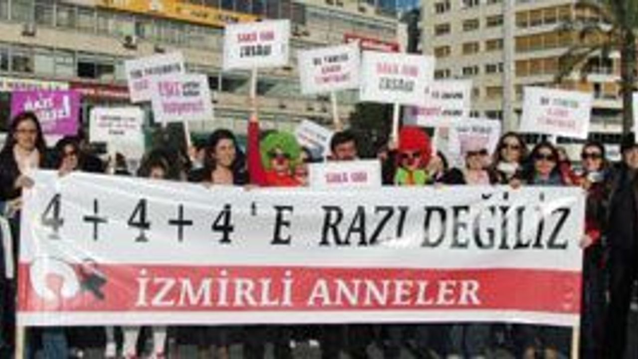 Alsancak Cumhuriyet Meydanı'nda toplanan anneler, boyunlarına önlük yakası ya da pembe çocuk atkısı taktı, ağızlarına emzik alarak, komisyondan geçen 4+4+4 yasası tasarısına razı olmadıklarını söyledi. Yaklaşık 200 annenin çocuklarıyla birlikte destek verdiği eylemde bazı babalar da yer aldı. Gündoğdu Meydanı'na kadar yürürken ellerinde, üzerinde 'Tepkisizsen suçlusun', '4+4+4'e razı değiliz' yazılı pankartlar taşıyan anneler, 'Devlet elini çocuğumdan çek', 'Şaka gibi yasaya hayır diyoruz', 'Kesintisiz 12 yıl eğitim istiyoruz' sloganları attı. Zaman zaman yere oturan anneler 'Daha dün annemizin' adlı çocuk şarkısıyla, kendi hazırladıkları 'Dünya yerinden oynar dört dörtten adam çıksa' adlı şarkıyı söyledi. Anneler, düdük de çaldı.