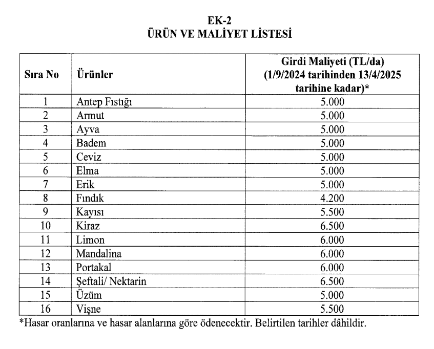 1 Şubat – 13 Nisan 2025 tarihleri arasında meydana gelen zirai don olayları nedeniyle ürünlerinde yüzde 20 ve üzeri hasar tespit edilen üreticilerin girdi maliyetleri, hasar alanı ve hasar oranına göre karşılanacak.