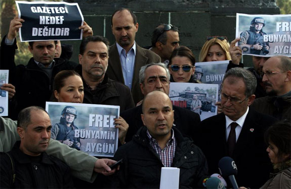 Türkiye Gazeteciler Federasyonu ve İzmir Gazeteciler Cemiyeti Başkanı Atilla Sertel de yaptığı konuşmada, Aygün'ün serbest bırakılması çağrısına katıldıklarını söyledi. Sertel, 'Aygün hiçbir siyasi düşünceye, amaca hizmet etmek düşüncesinde değildir. Sadece mesleğinin ve kendi gazetesinin görevinin peşindeydi. Onu ellerinde bulunduranlara sesleniyoruz. Türkiye'de gazeteciler zaten çok büyük sıkıntılar içerisinde. Çok büyük çileler çekiyorlar. Türkiye'de gazetecilik mesleğini onurlu başı dik insanlar ayakta tutma gayreti içindedir. Aygün sadece ve sadece orada yaşanan savaşın tarafı değil, savaşın bir dünyanın kamuoyuna taşınmasında haberci olarak görev yapıyor. Hemen özgür bırakılmasını istiyoruz. Başbakan, Dışişleri Bakanlığı, İçişleri Bakanlığı, devlet büyüklerine bu konuda duyarlı olmaları çağırısı yapıyoruz' dedi. Türkiye Gazeteciler Sendikası İzmir Şubesi Başkanı Halil Hüner de Aygün'ün serbest bırakılması için girişimlerin arttırılmasını istedi. Açıklamaya, gazeteciler ve meslek örgütleri temsilcileri katıldı.(dha)