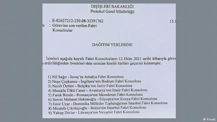 DW Türkçe'den Alican Uludağ'ın haberine göre; Dışişleri Bakanlığı aralarında İngiltere, İsveç ve Belçika'nın da bulunduğu 9 ülkenin Türkiye'deki fahri konsolosunun görevlerine son verdi. Konsoloslar arasında İzmir'den iki isim var. Bu isimler, Belçika'nın İzmir Fahri Konsolosu Nezih Öztüre ve Avusturya'nın İzmir Fahri Konsolosu Mustafa Ülkü Caner.