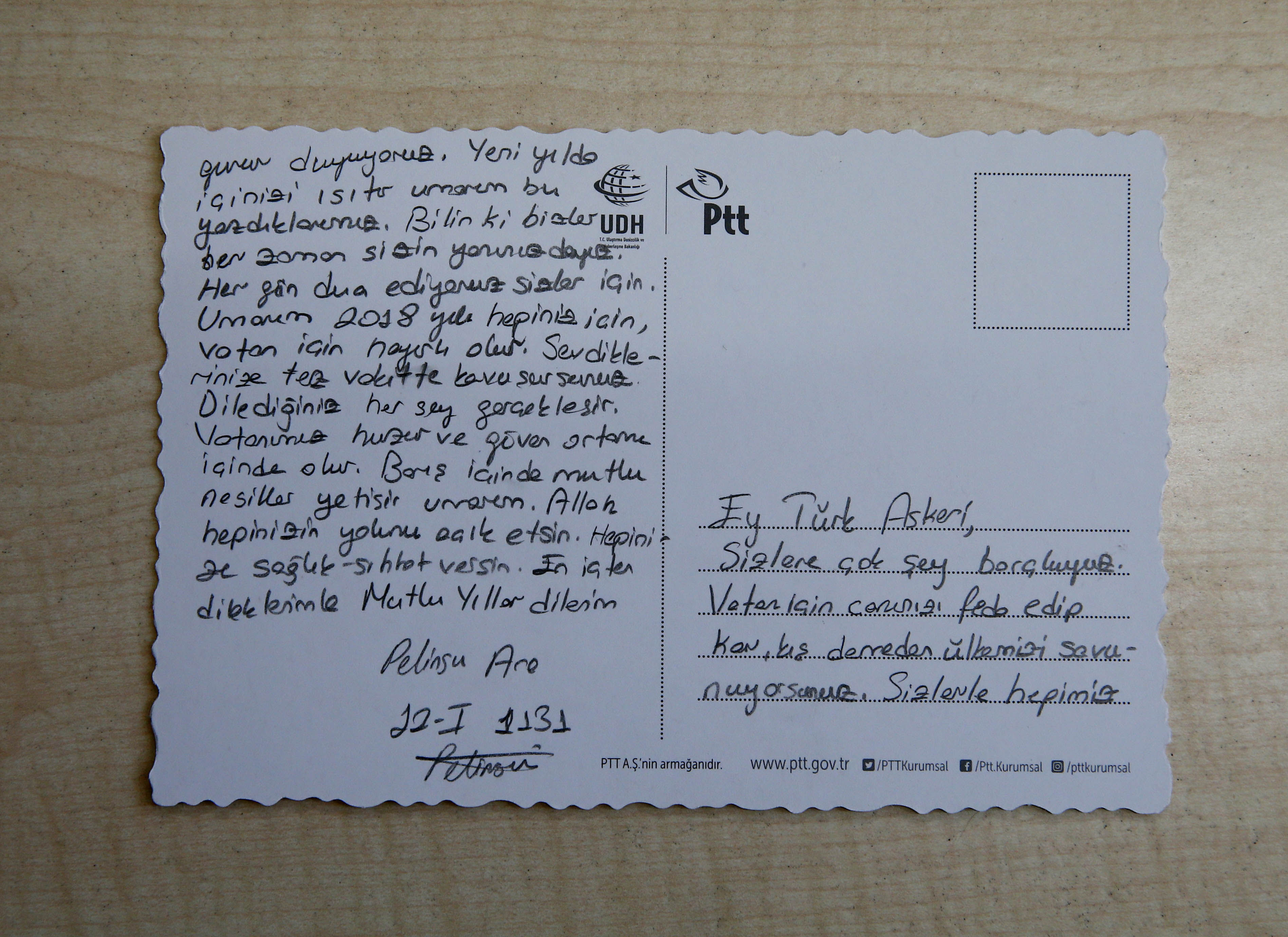 Yazdığı kartta Mehmetçiklerin yeni yılını kutladığını ifade eden Öztürk, 'Bizim için karda, kışta nöbet tuttukları için teşekkür ettim. Sağlıklı bir yıl diledim. Her zaman arkalarında olduklarımızı bilmelerini istedim.' diye konuştu.