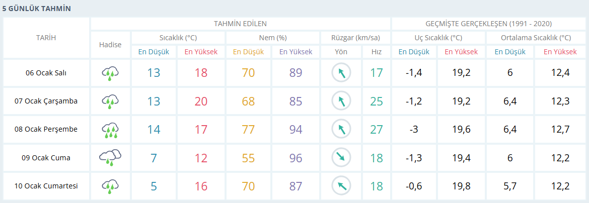 Çarşamba gününe kadar kıyı ilçeler ağırlıklı yağışlar etkili olmaya devam edecek. Bu yağışlar uzun süreli değil, gelip geçici yağışlar olacak. Ara sıra güneş de açacak. Sıcaklıklar yarın 17-18, haftanın ilk 3 günü 20 dereceye yakın seviyede olacak. Rüzgâr keşişlemeden kuvvetli esmeyi sürdürecek. Perşembe günü cephe öncesi şiddetli yağmurlar görülebilir. Cephe geçişi sonrası sıcaklıklar yine hızlıca düşecek. Gelecek haftanın sonunda yine soğuk etkisinde olabiliriz. Sonra detaylandırırız.
